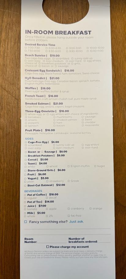 We experienced in-room breakfast, and breakfast at the main restaurant. Prices were on the upper end of fair. I’ve definitely seen more outrageous pricing elsewhere.