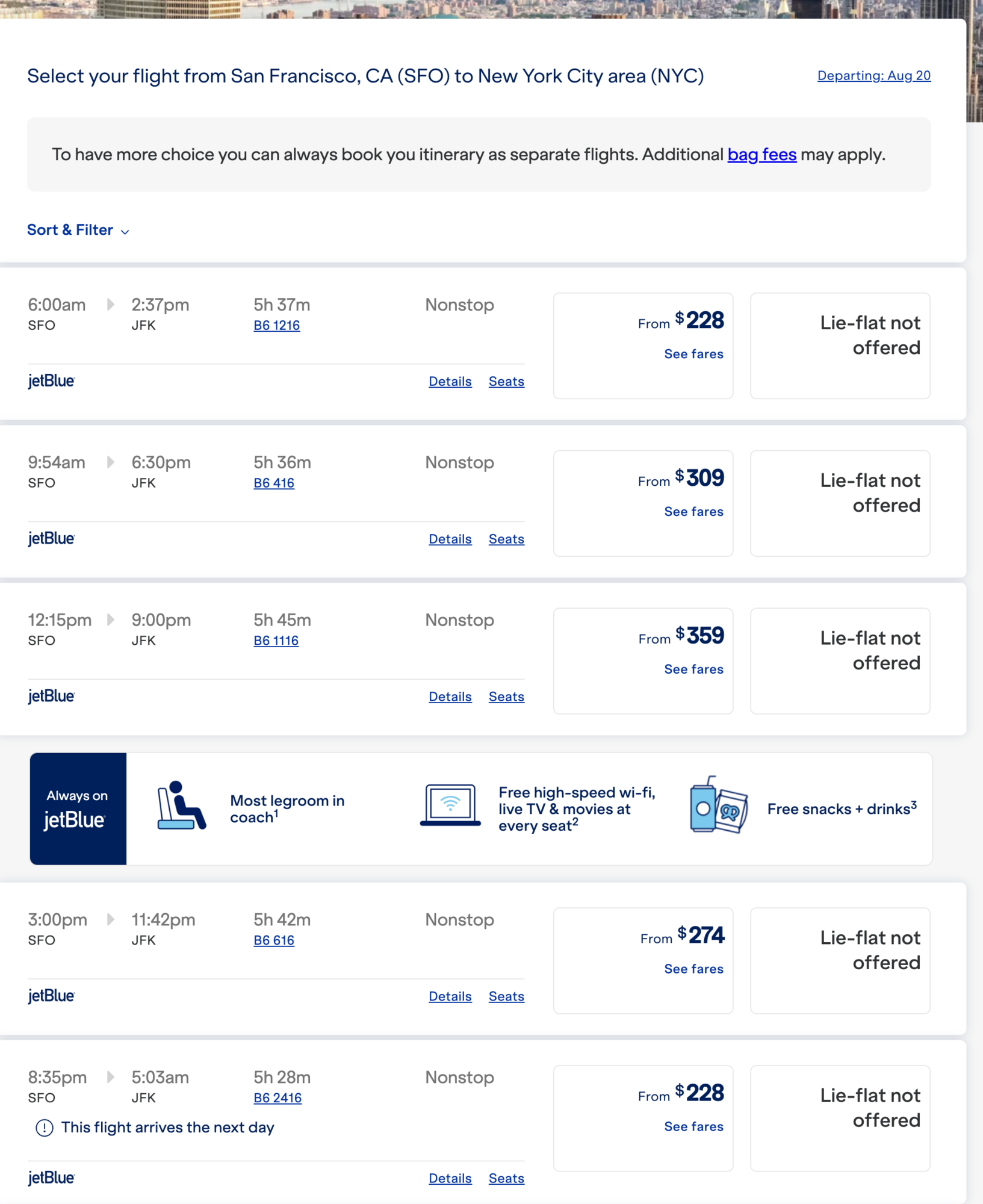 I'm attempting to book a SFO => JFK, and then JFK => EDI two days later, with cash. Mint is available when I try to book individually, but when I try to string together a multi-city trip, for some reason it always says: "Lie-flat not offered". Is there any way to book it, or should I try calling them over the phone?