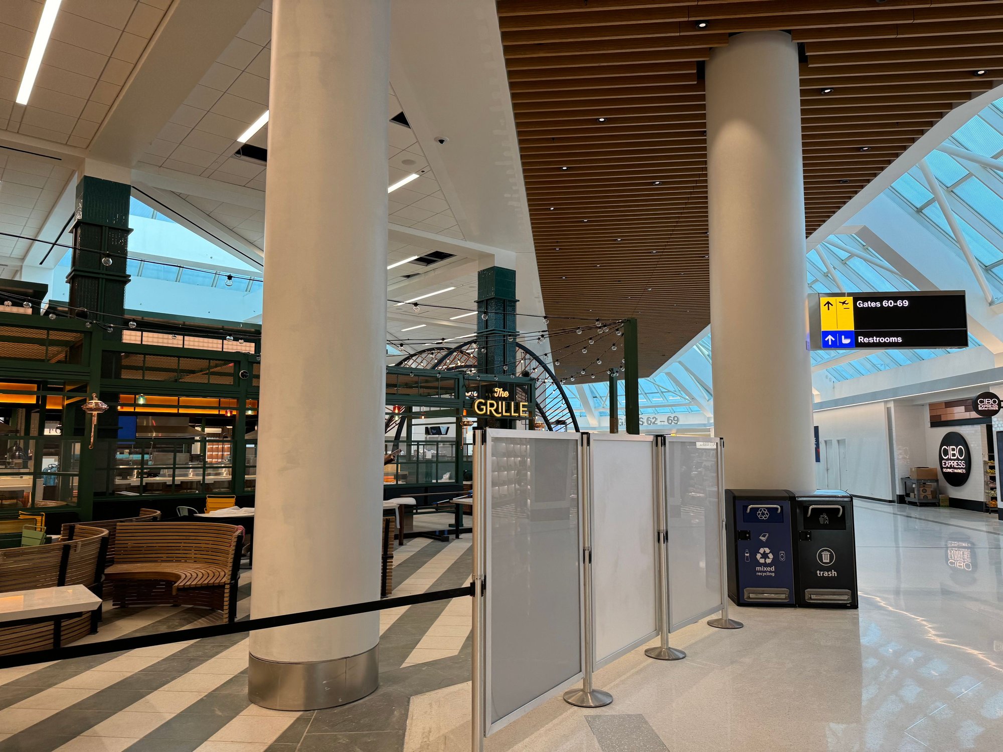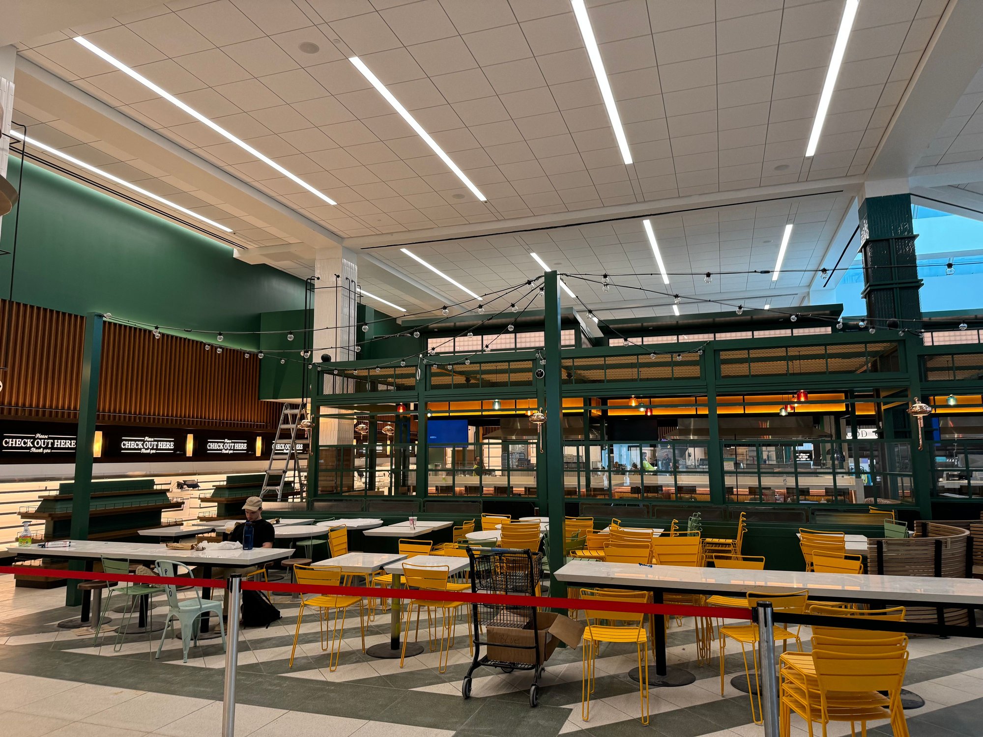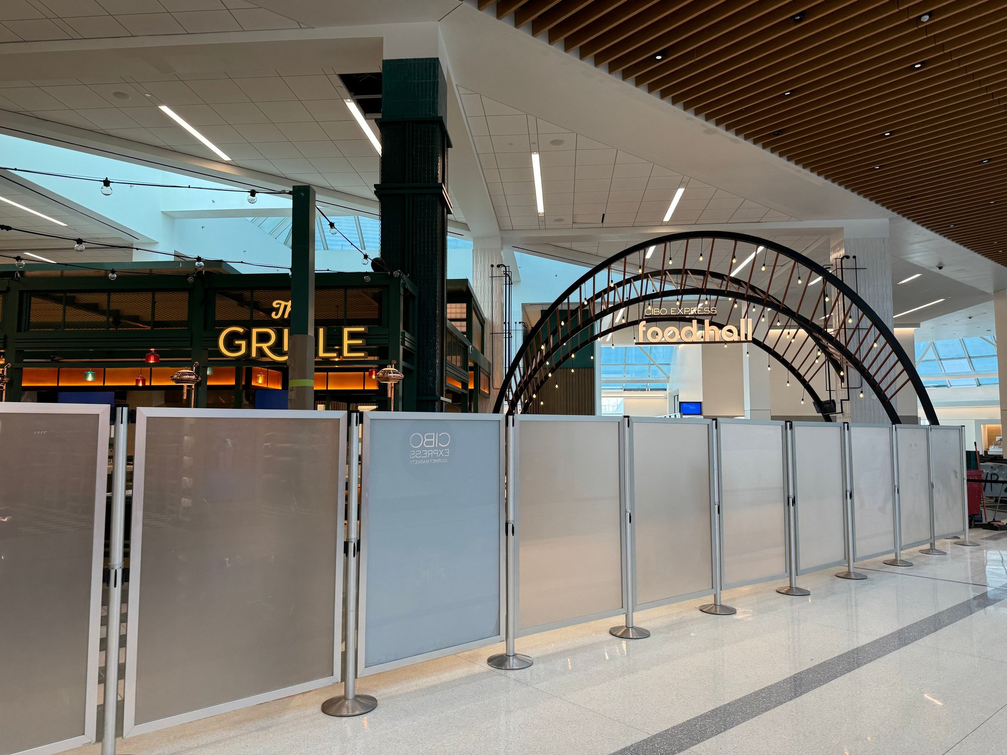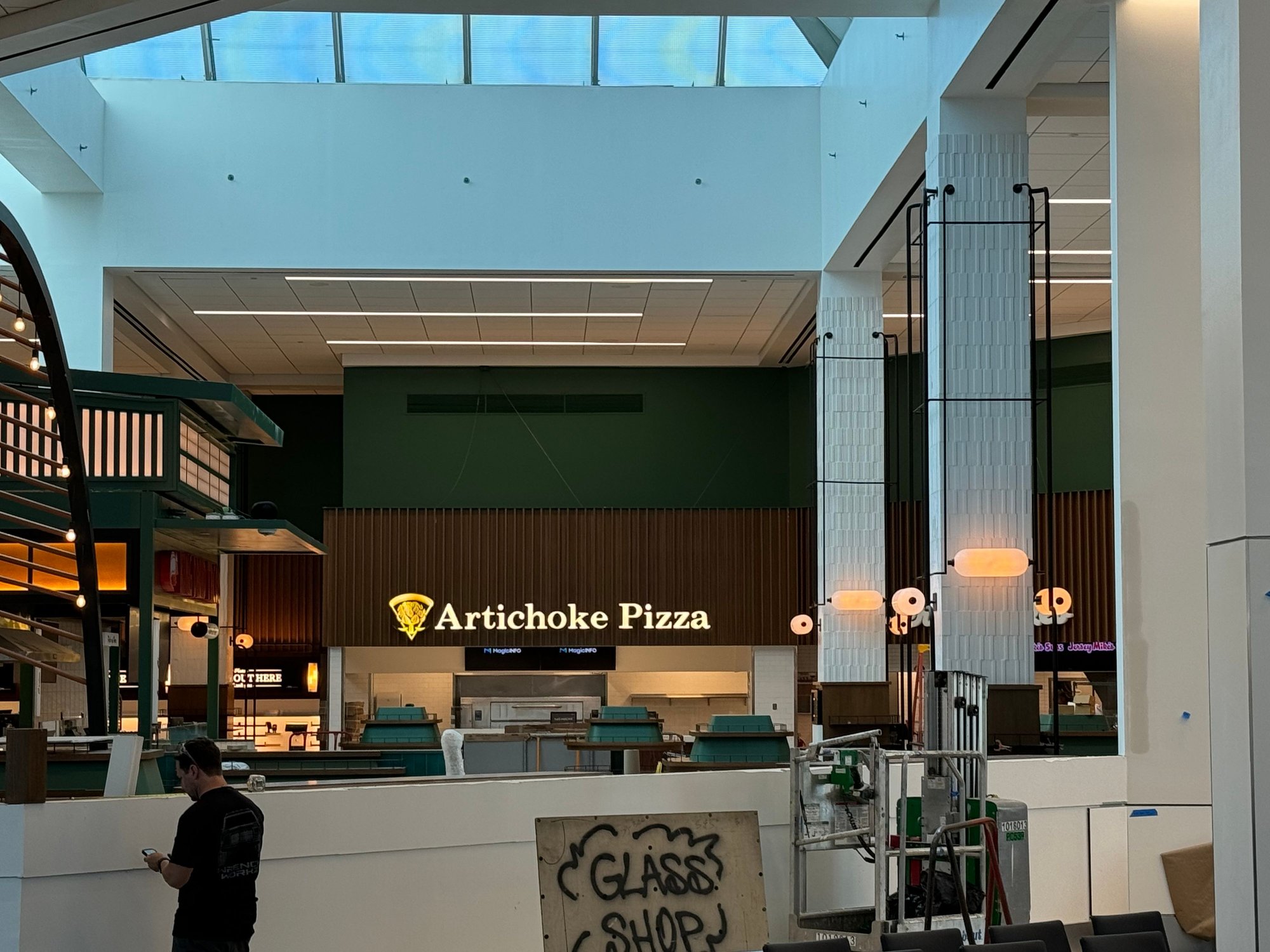 The food court has been revealed, but is not yet open. It has a fresh feel while also reminding me of the previous Terminal C food court. For branded options, there will be a Jersey Mike’s and an Artichoke Pizza. There are a few others that I couldn’t make out due to the full-height construction walls I was photographing over.
