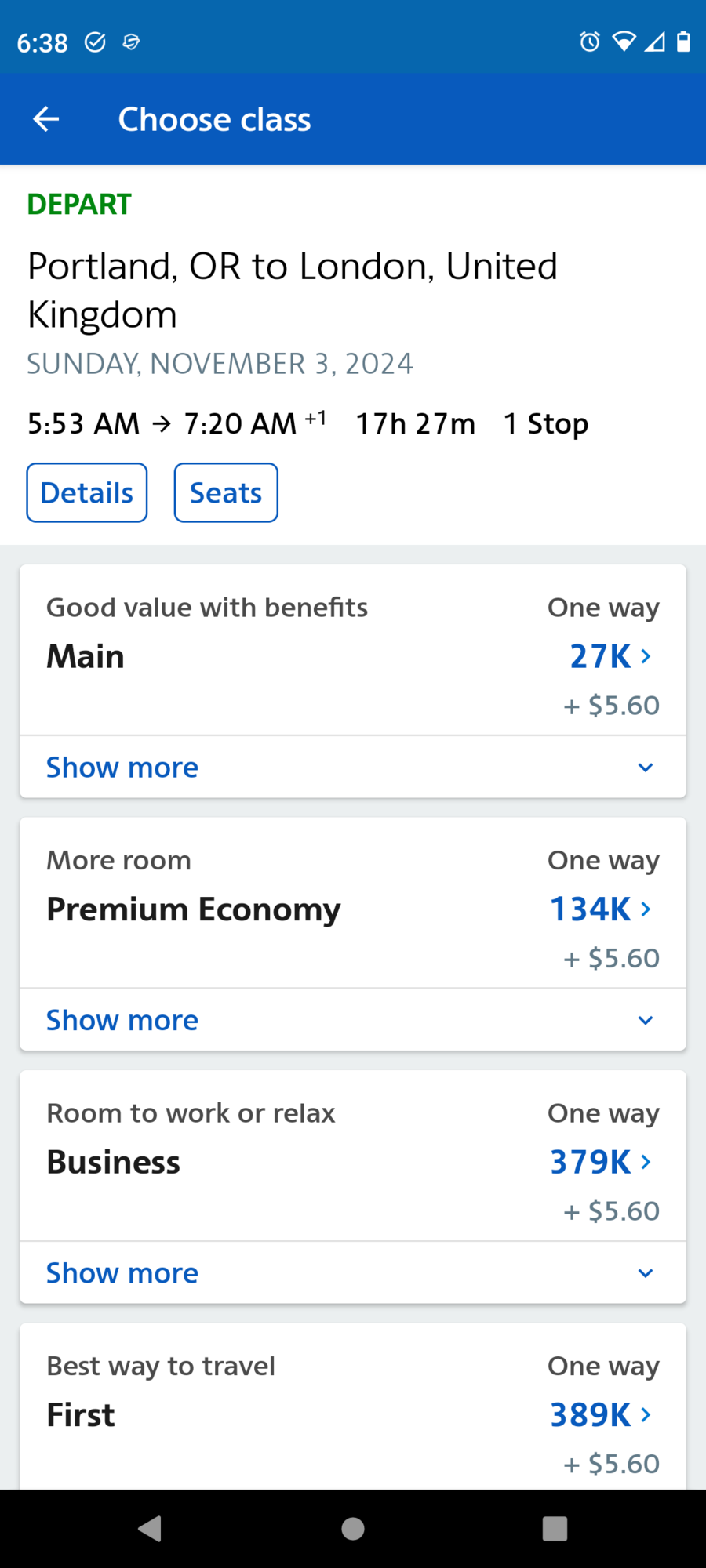 Portland, OR (PDX) to London-Heathrow (LHR) Sunday, November 3 Flight BA 266,