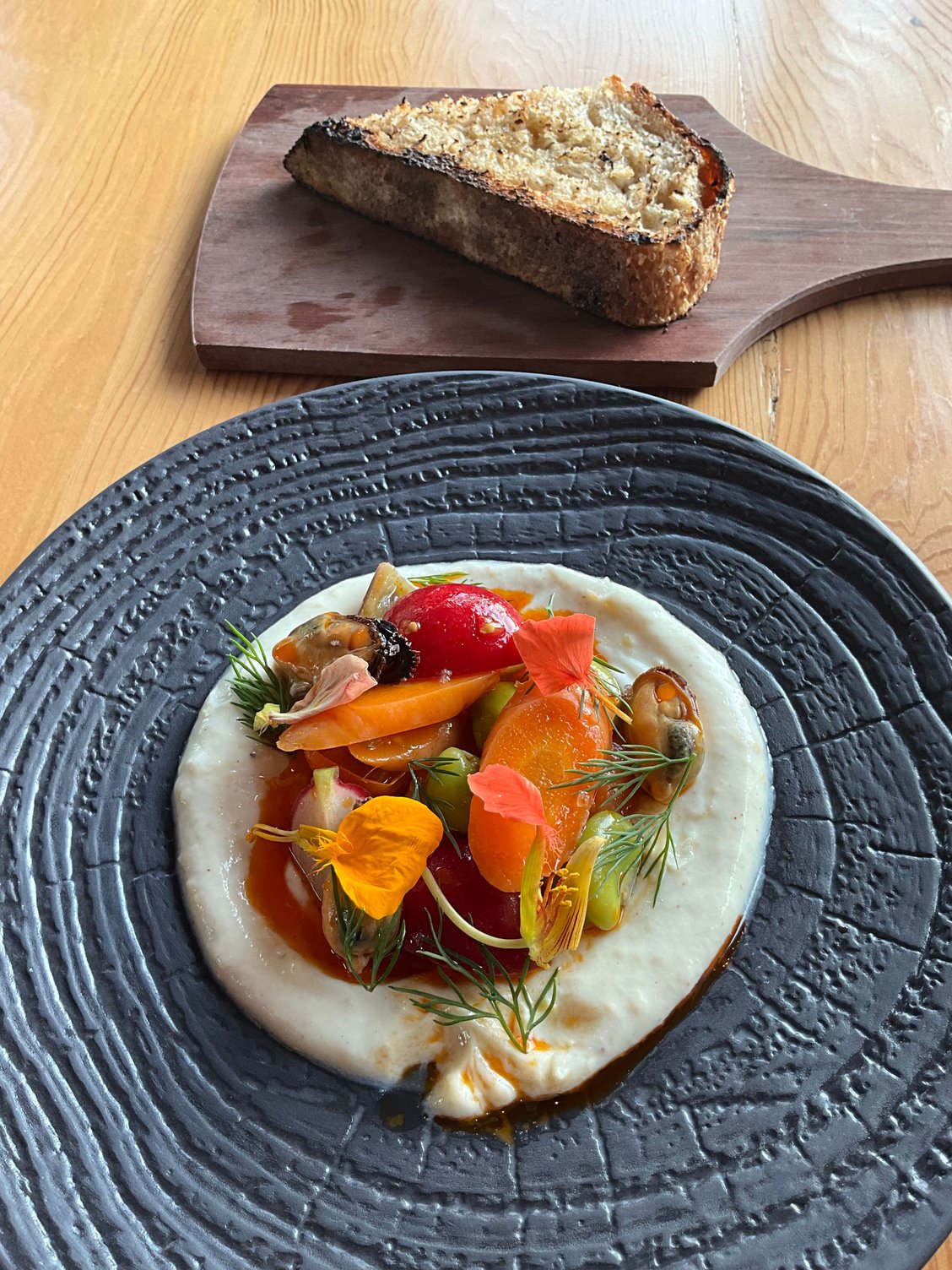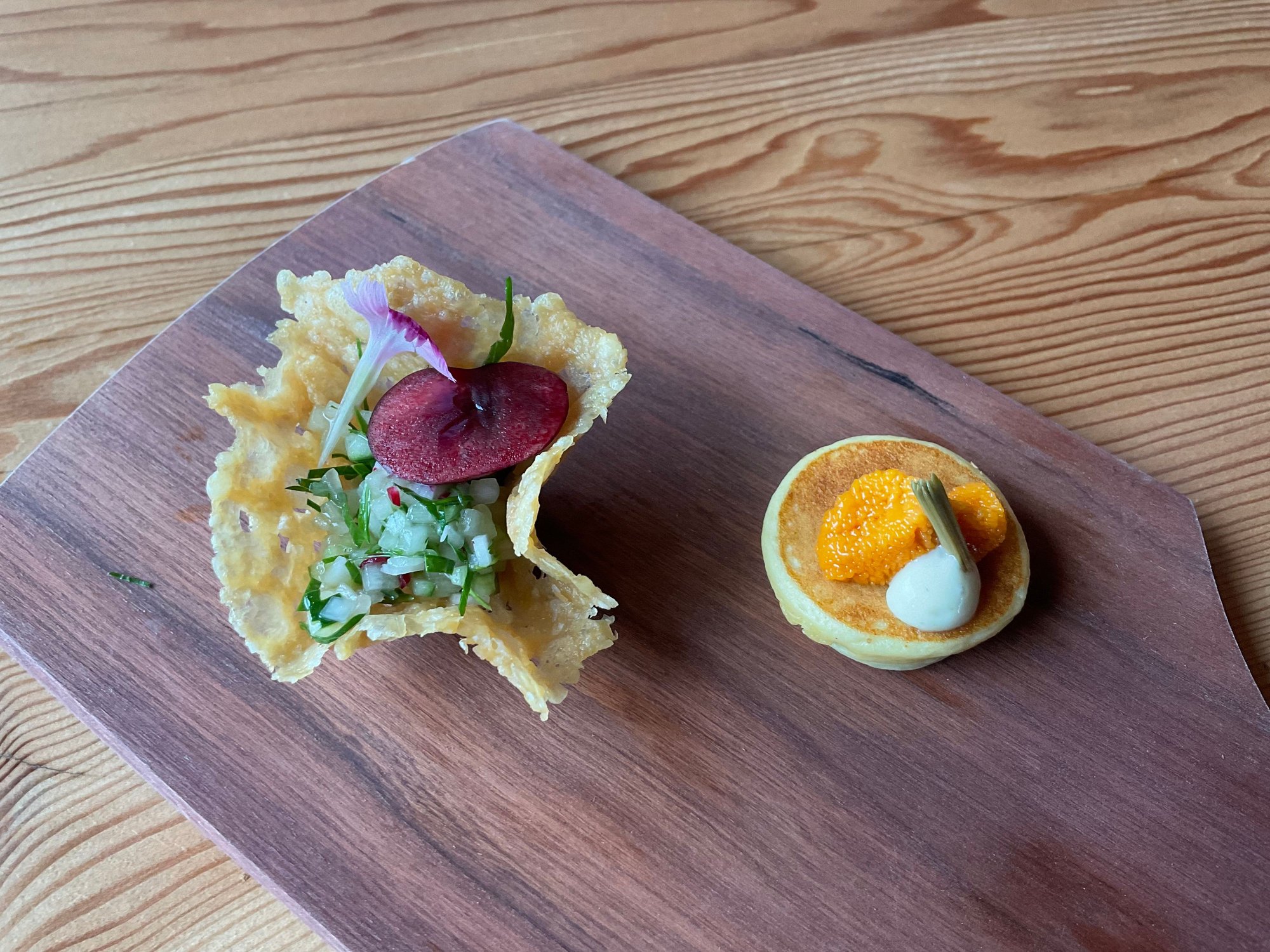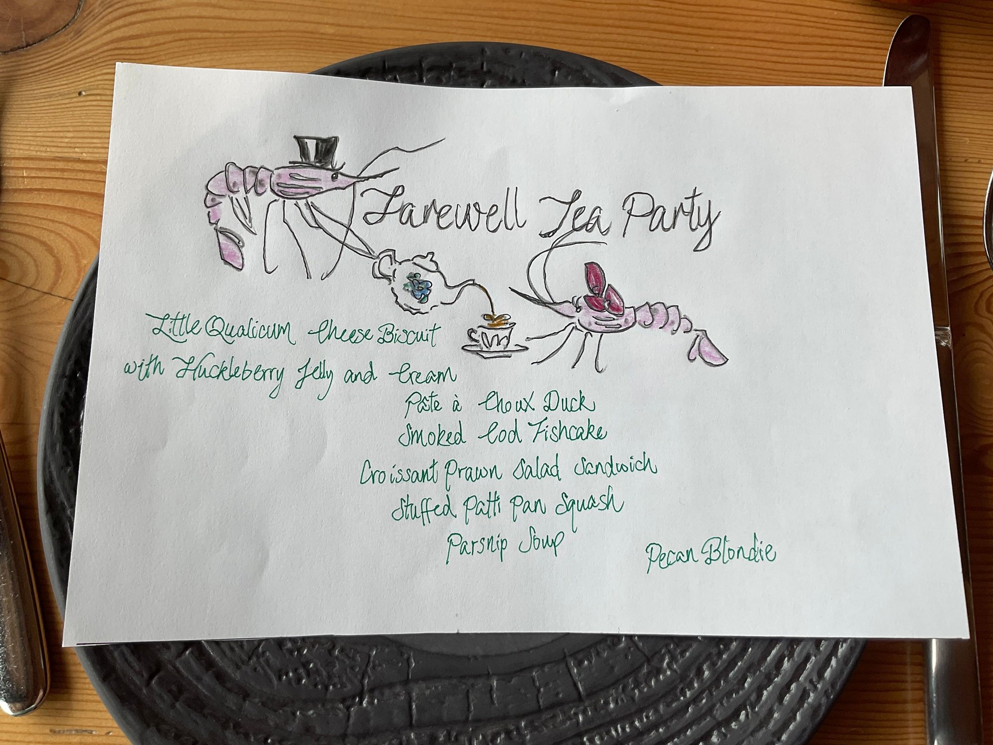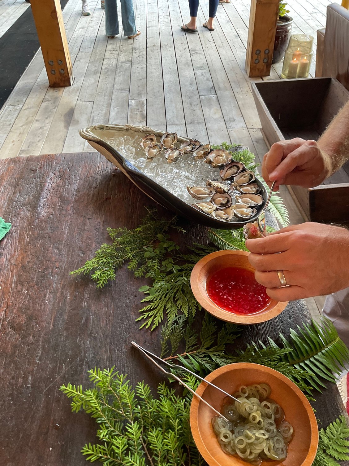 Let me preface this by saying I lost my notes so don’t recall the names of everything. To cut to the heart of the matter, food was outstanding, not too fussy, surprising ingredients, gorgeously plated and presented. Wines were very good quality, if one wanted there is a cellar of the super fine stuff for purchase. All drinks (I recommend the Nordic Fizz), wines, beers, etc. included as are all meals. And the meals are splendid. Ate my first Bambi, delicious; and my first urchin. The mushrooms are locally foraged as is much else (spruce tips, seaweed, greens) and some gardened. Spotted prawns are caught right off the dock; fish and crab locally caught. Everything brilliantly tasty and creative. The kitchen is amazing.