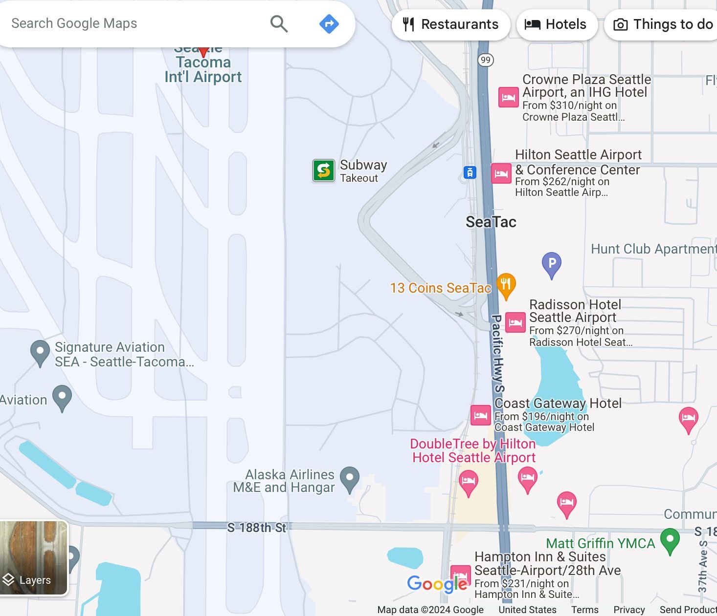 when facing back the direction of the bridge/ airport looking over international blvd…the Hilton is on the left atvthe corner. To thr right is a crown plaza. Behind you down the side street there is a Marriott the same side as Hilton and on the same side of crown plas therr is a sure stsy best western ( pre Covid it was a choice comfort inn iirc)