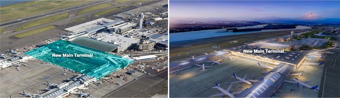 Not Alaska's fault. The portion of the terminal that the new lounges will be located in hasn't even been built yet. The lounges will be part of Phase 2 construction (see diagram two posts above). The challenge of this project was building a new terminal directly on top of the old one--all while keeping it operational for 15-20 million passengers per year the entire time. In the two pictures below, you can see the footprint of the old and new terminals overlaid on top of each other.
