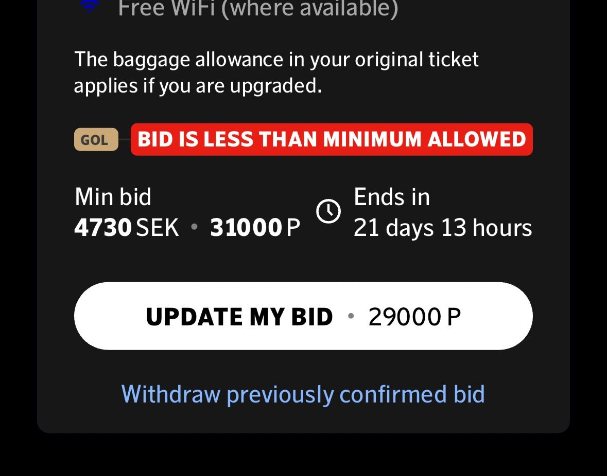 I have a revenue SAS plus flight coming up and I bid 29000 using points right after booking. Now the flight is 3 weeks away and the minimum bid is 31000 points.