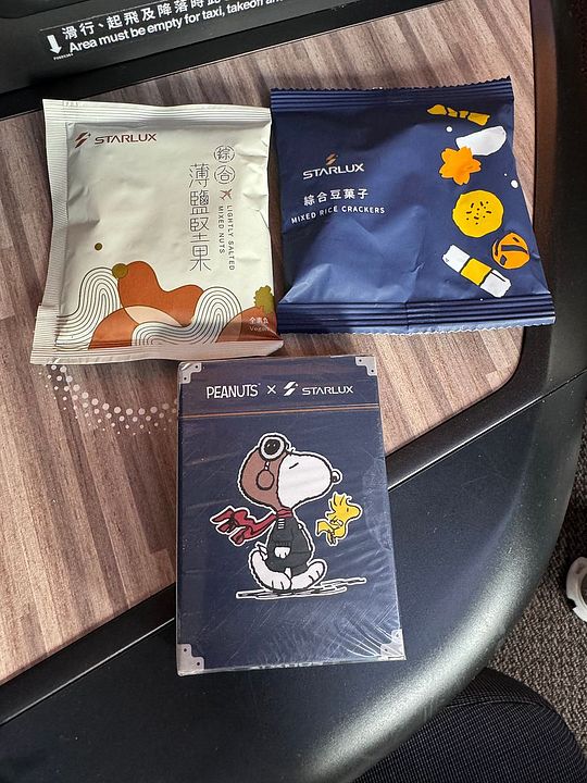 Despite a late start, door was closed only 15 minutes late at 11:10am, but unfortunately the weather had gotten worst, as a wave of thunderstorm was passing through the airport. ATC basically had to space 3-5 minutes between each eastbound flight, and we were number 30. The flight attendants passed around orange juice in business class, along with packaged rice crackers and mixed nuts, along with Snoopy playing card.