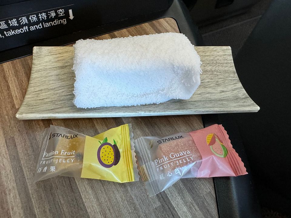 Hot towel and assorted candies were handed out after the meal service, as we started our descent!