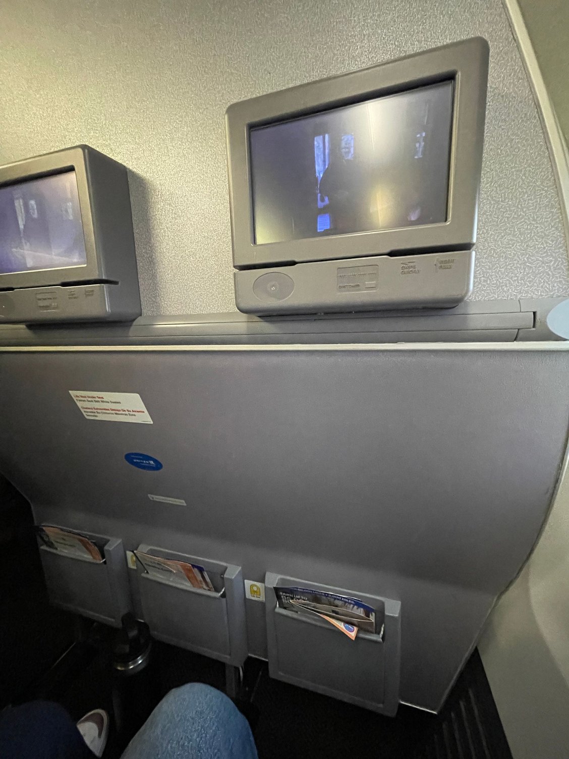 I virtually always go for the exit row on this plane, but had noticed that the bulkhead seats looked good on another flight recently. Unfortunately, I find this when seated in 7F. The bulkhead bends toward the row 7 seats, and extends to about 5 inches from the floor. This means that a carry-on thicker than 5 inches isn’t going under. Back to the exit row for me.