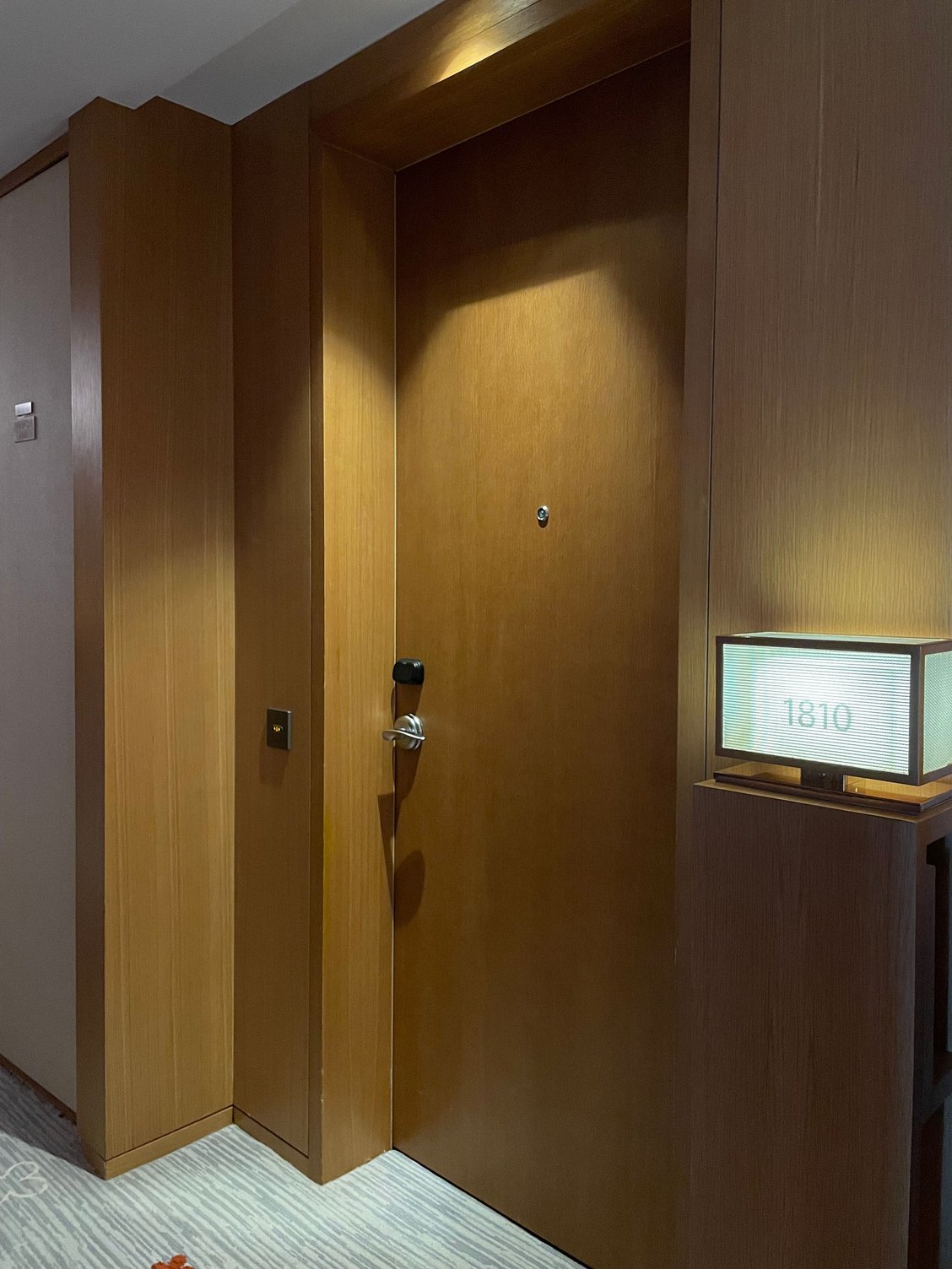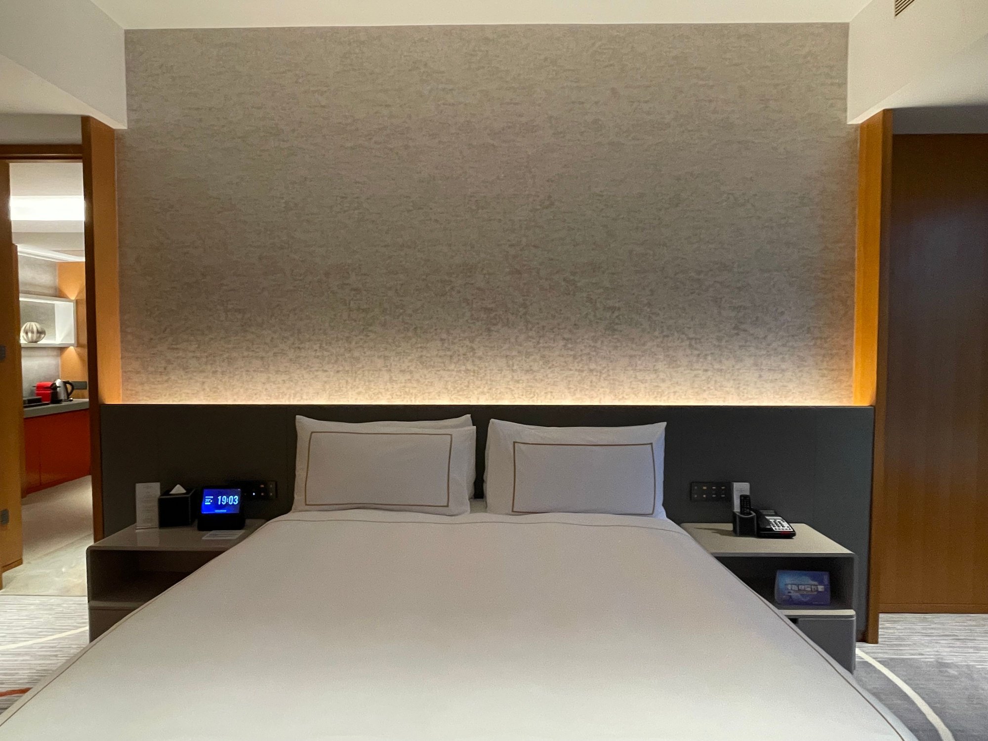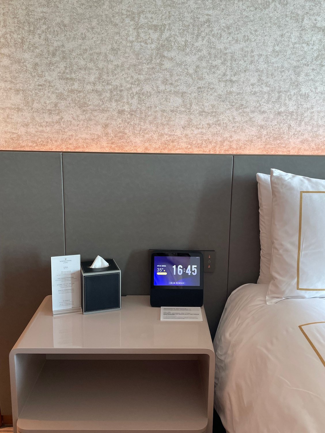 Bedroom with comfortable bed. Room control panel (in Chinese only).