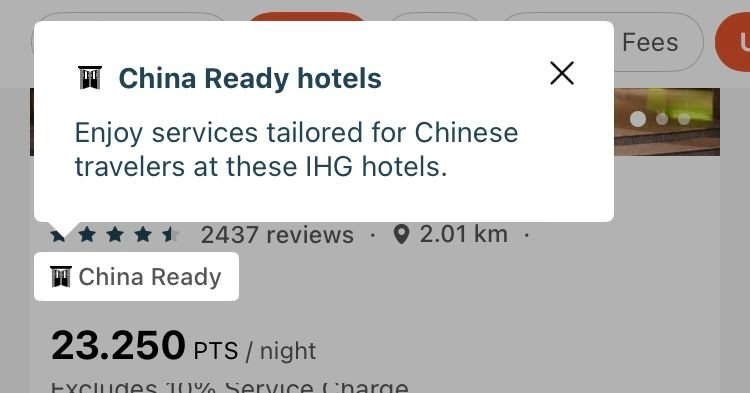 IHG has a new feature denoting “China Ready” hotels. Not sure exactly what that means, although I’m assuming part of it is securing breakfast buffets against Chinese visitors loading up a dozen croissants and 3 kilos of sliced pineapple for a party of two, putting a dozen plates in the middle of the table, and letting 95% of the food go to waste. Interestingly, not all hotels in Hong Kong and Singapore are “China ready”. And perhaps even more interestingly, some in Taiwan are.