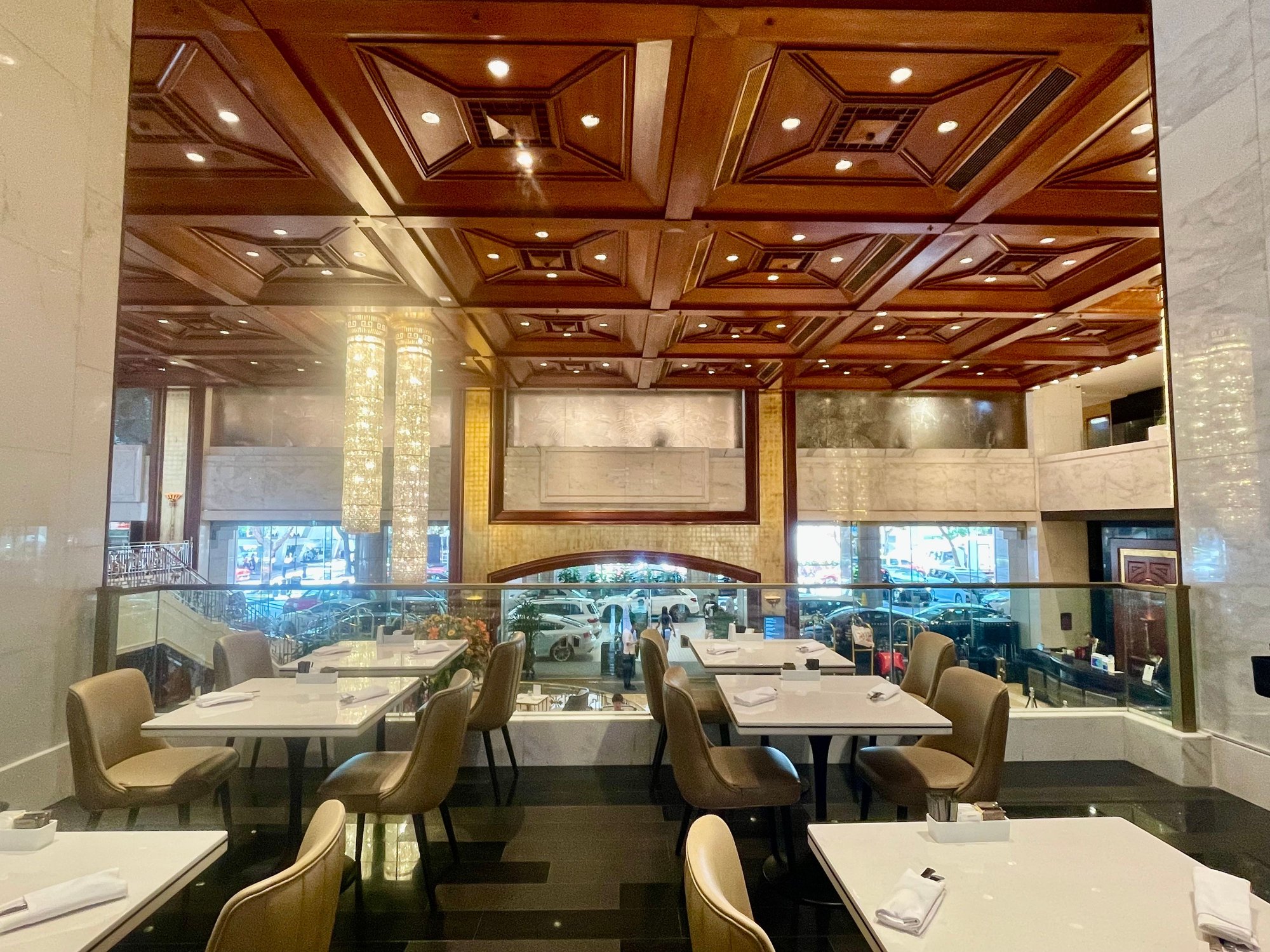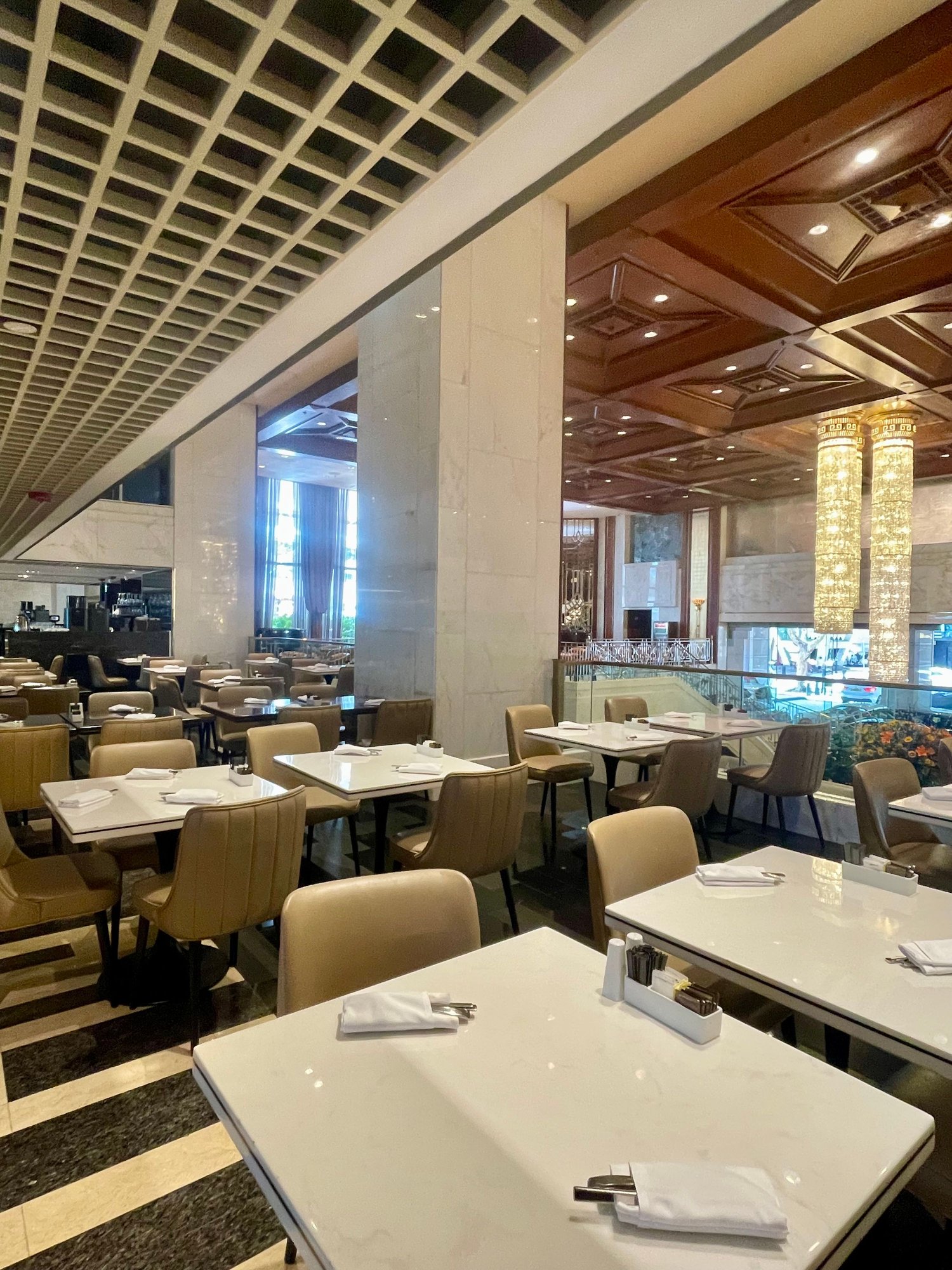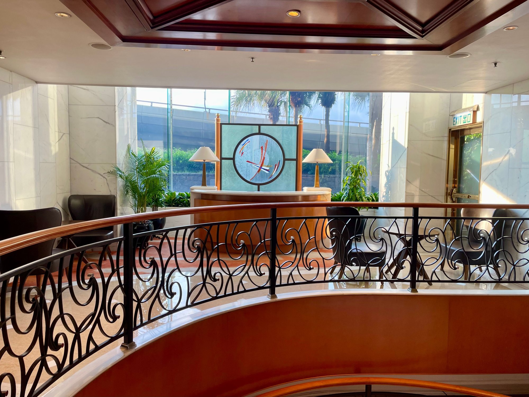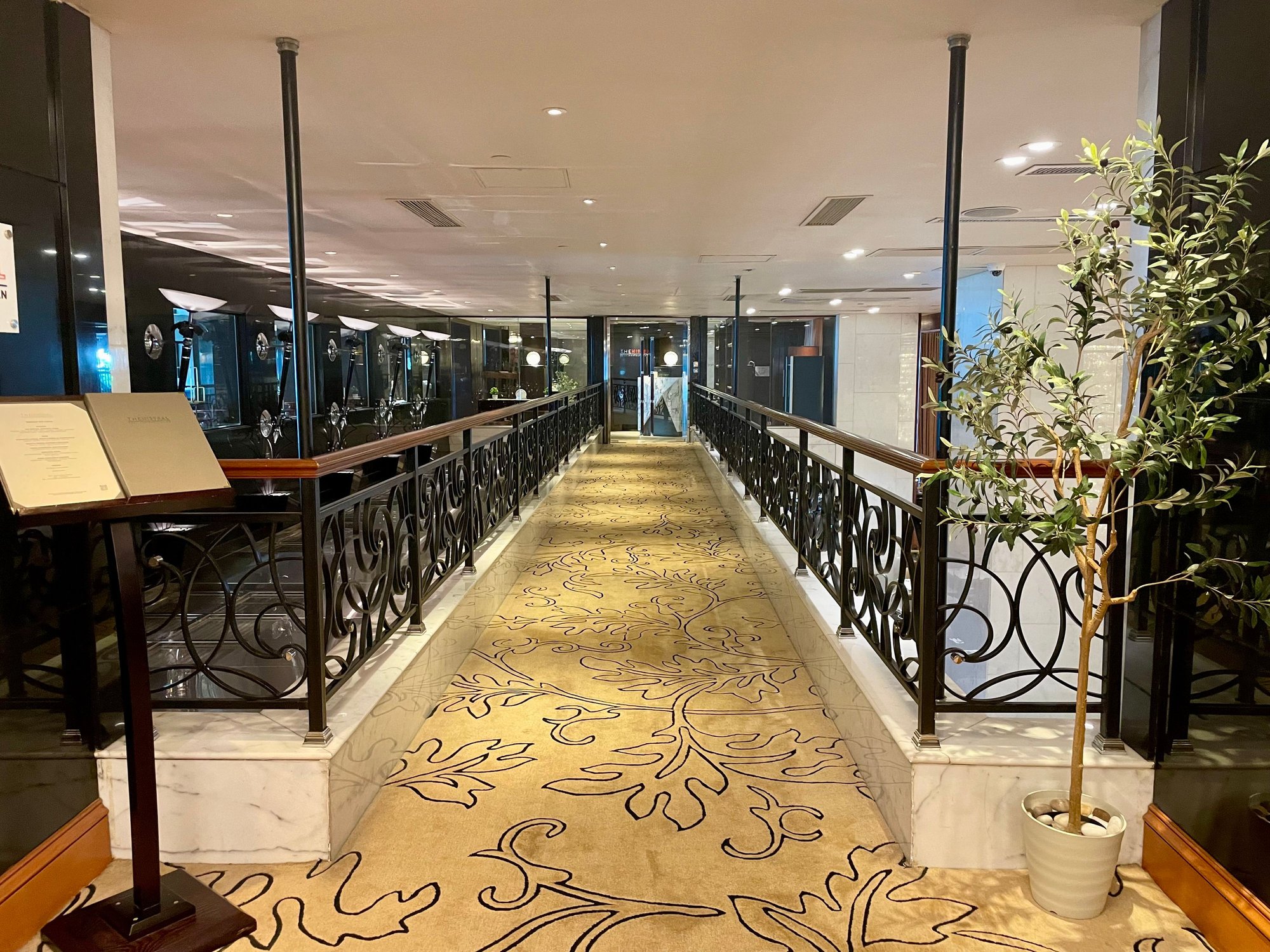 Seating area over the lobby. Dining area in the back with (partial) view over Harbour.