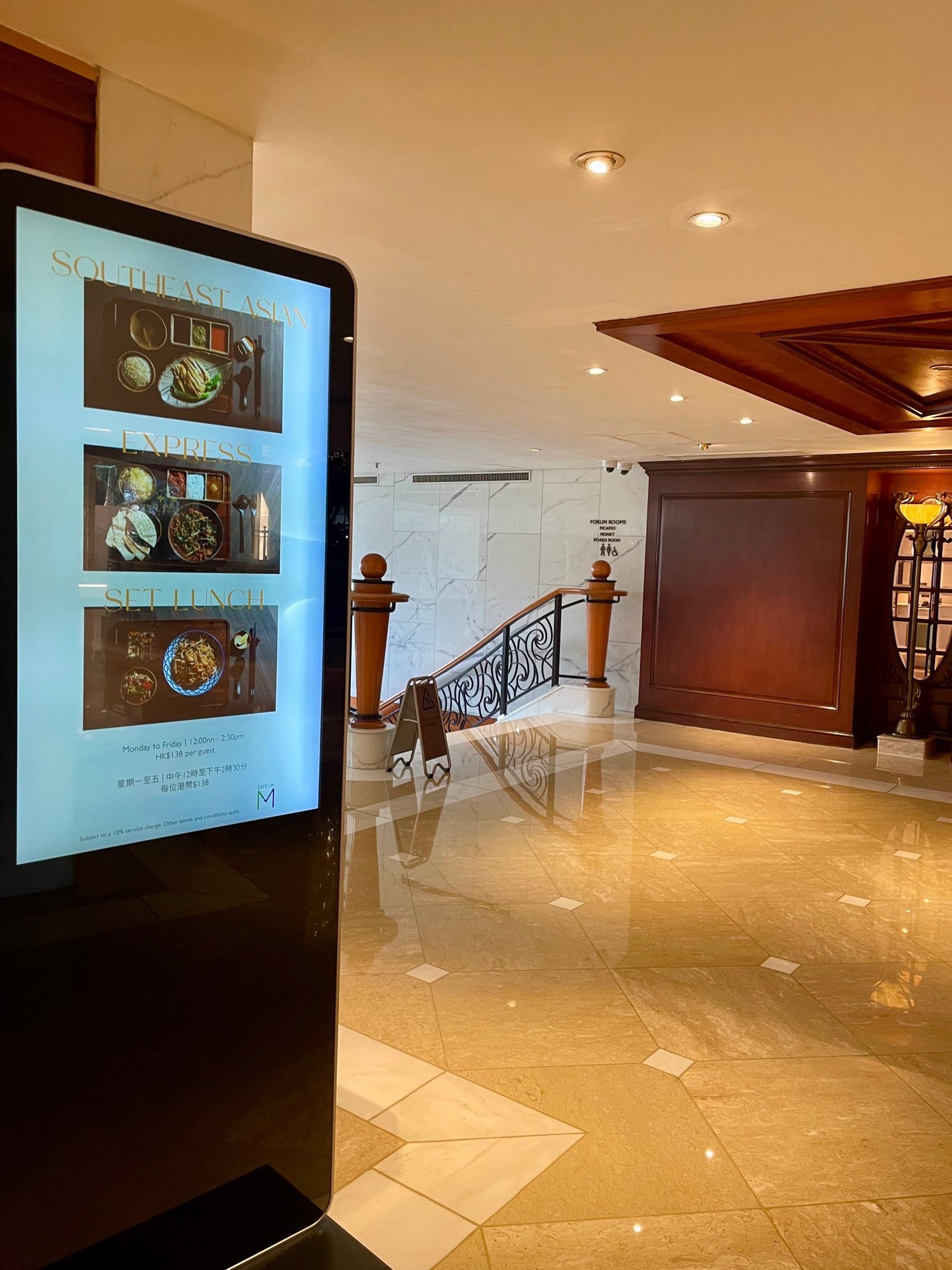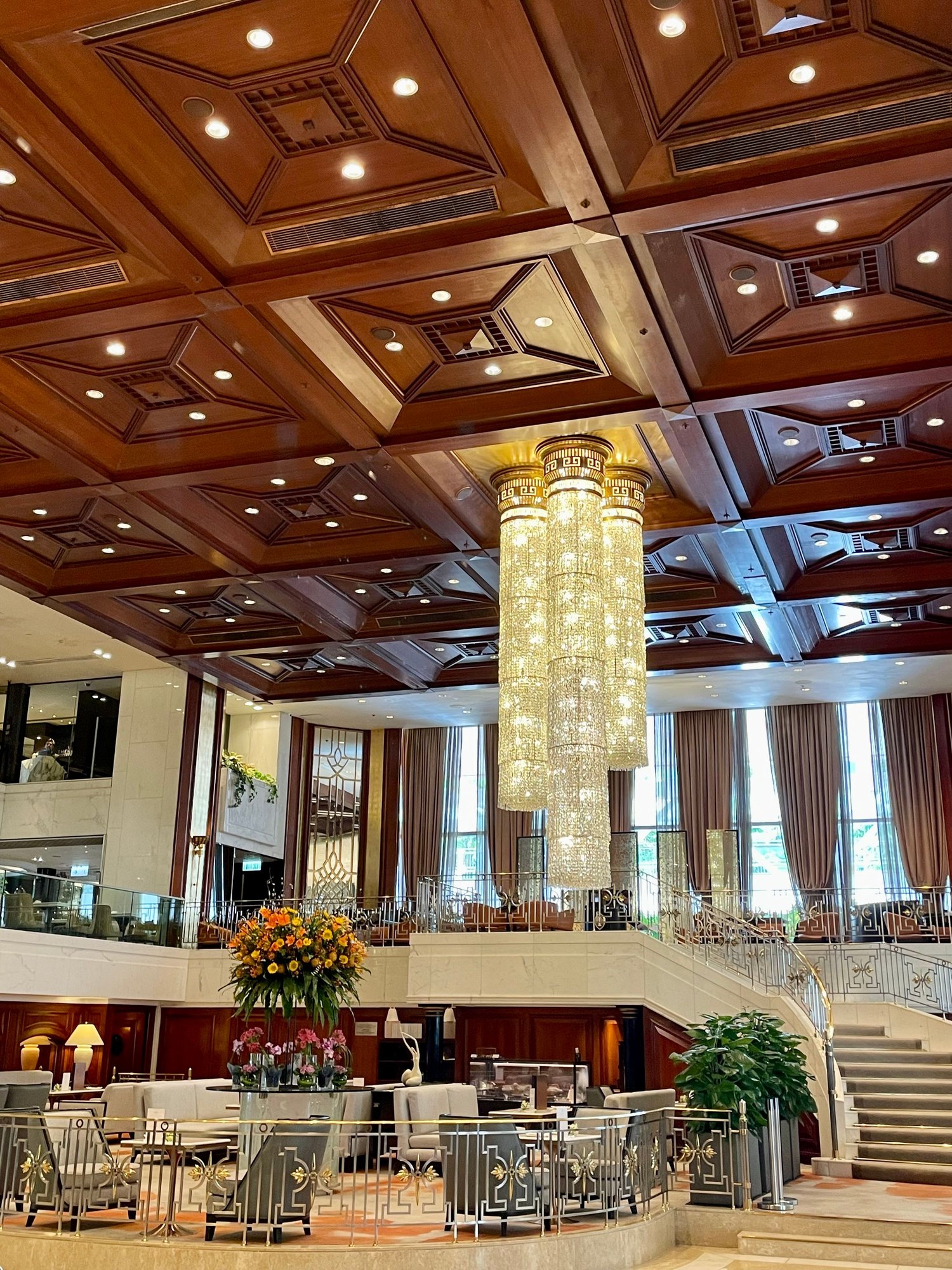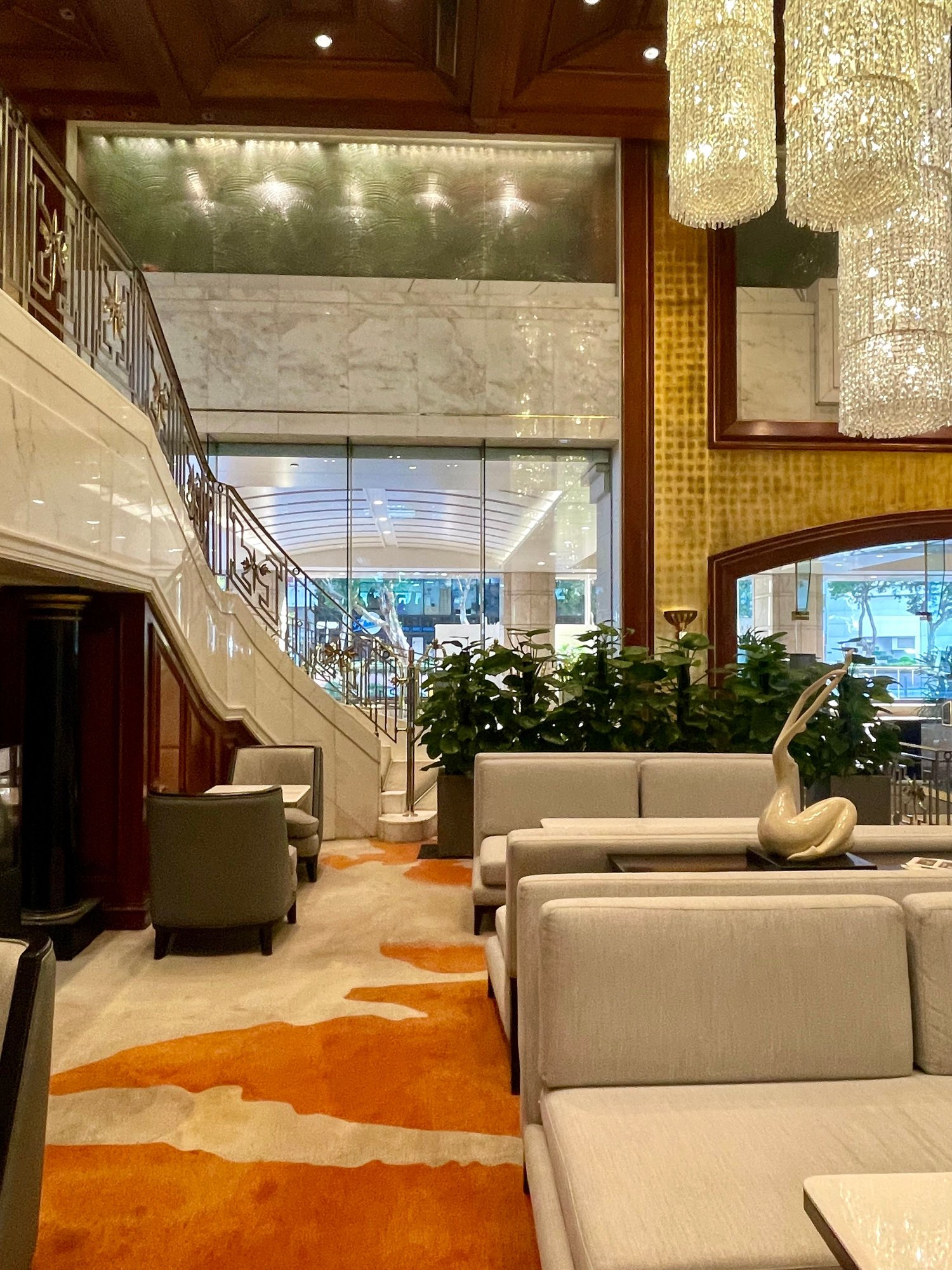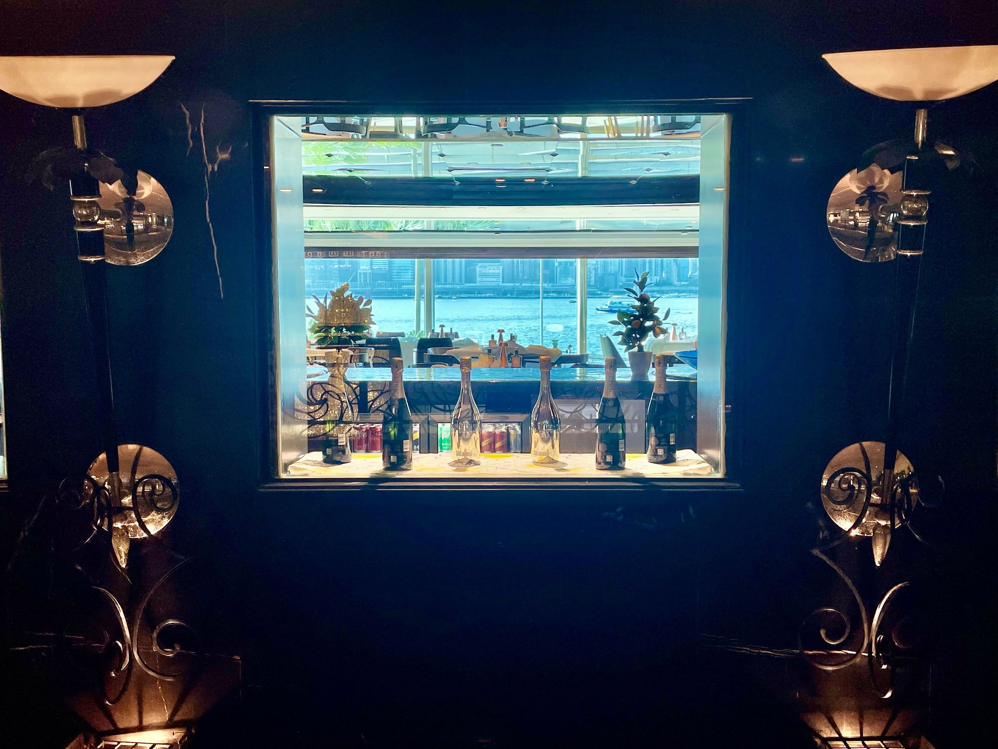 Seating area over the lobby. Dining area in the back with (partial) view over Harbour.