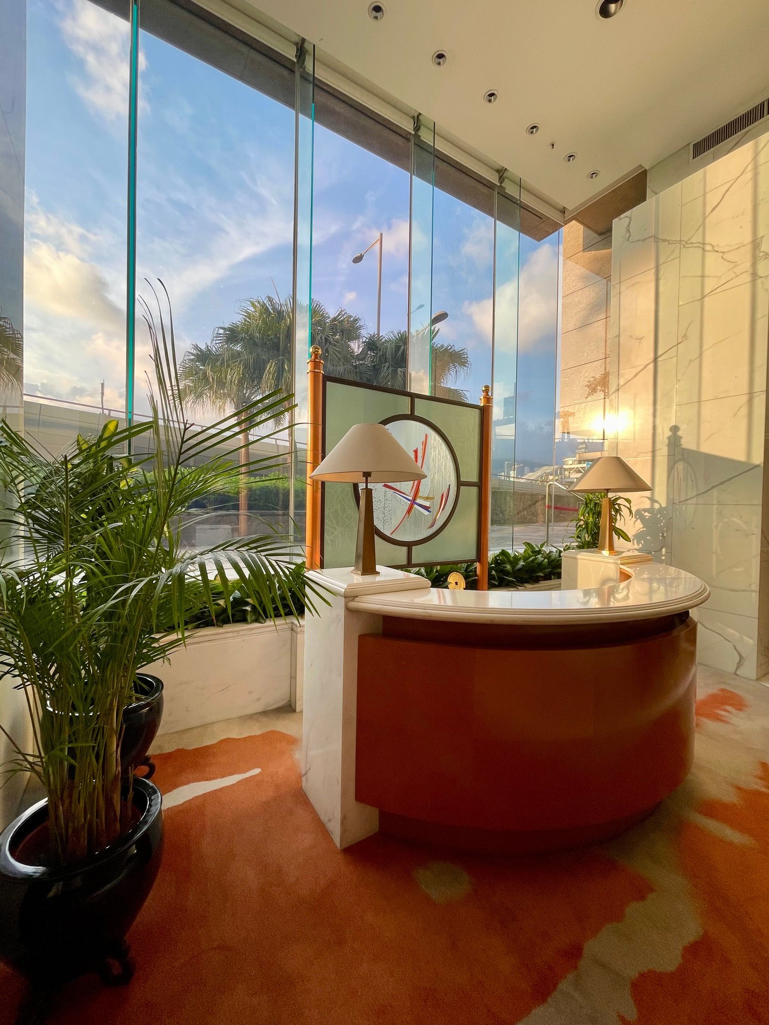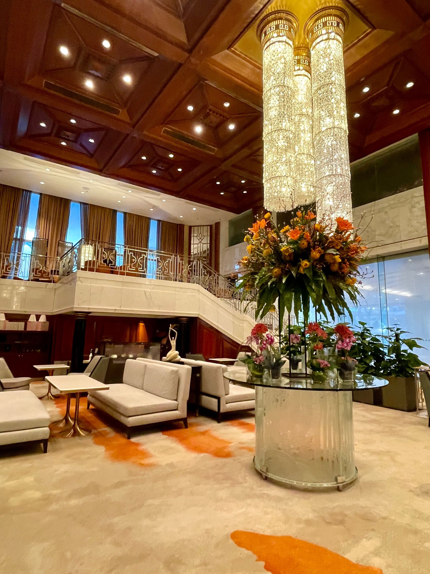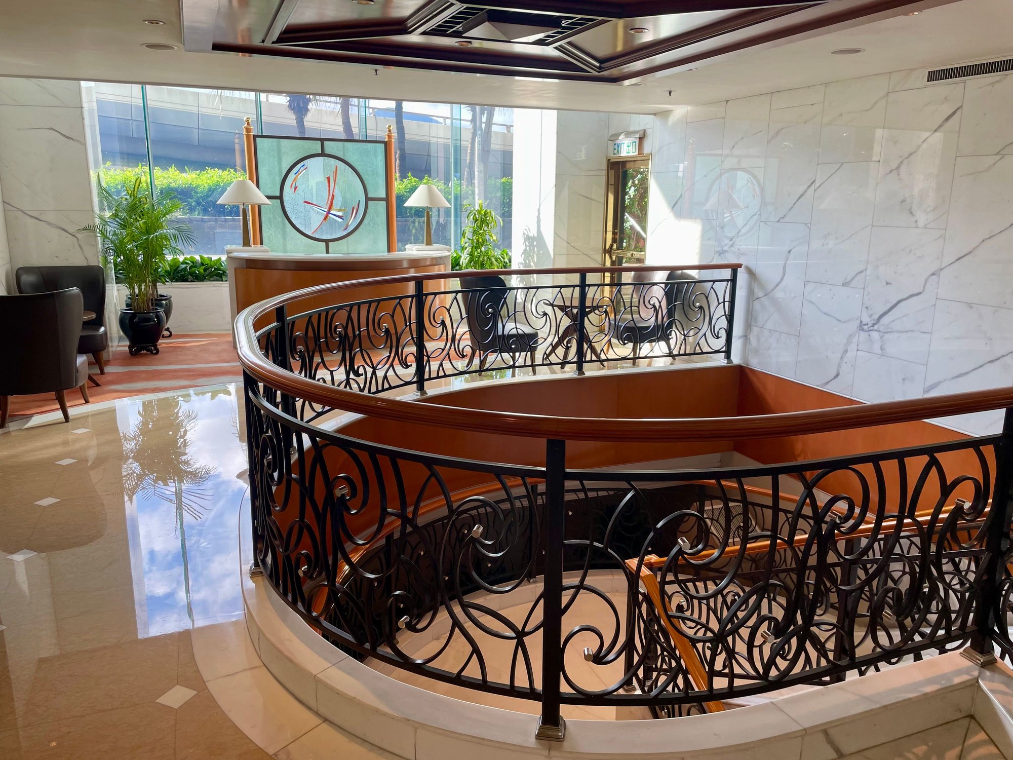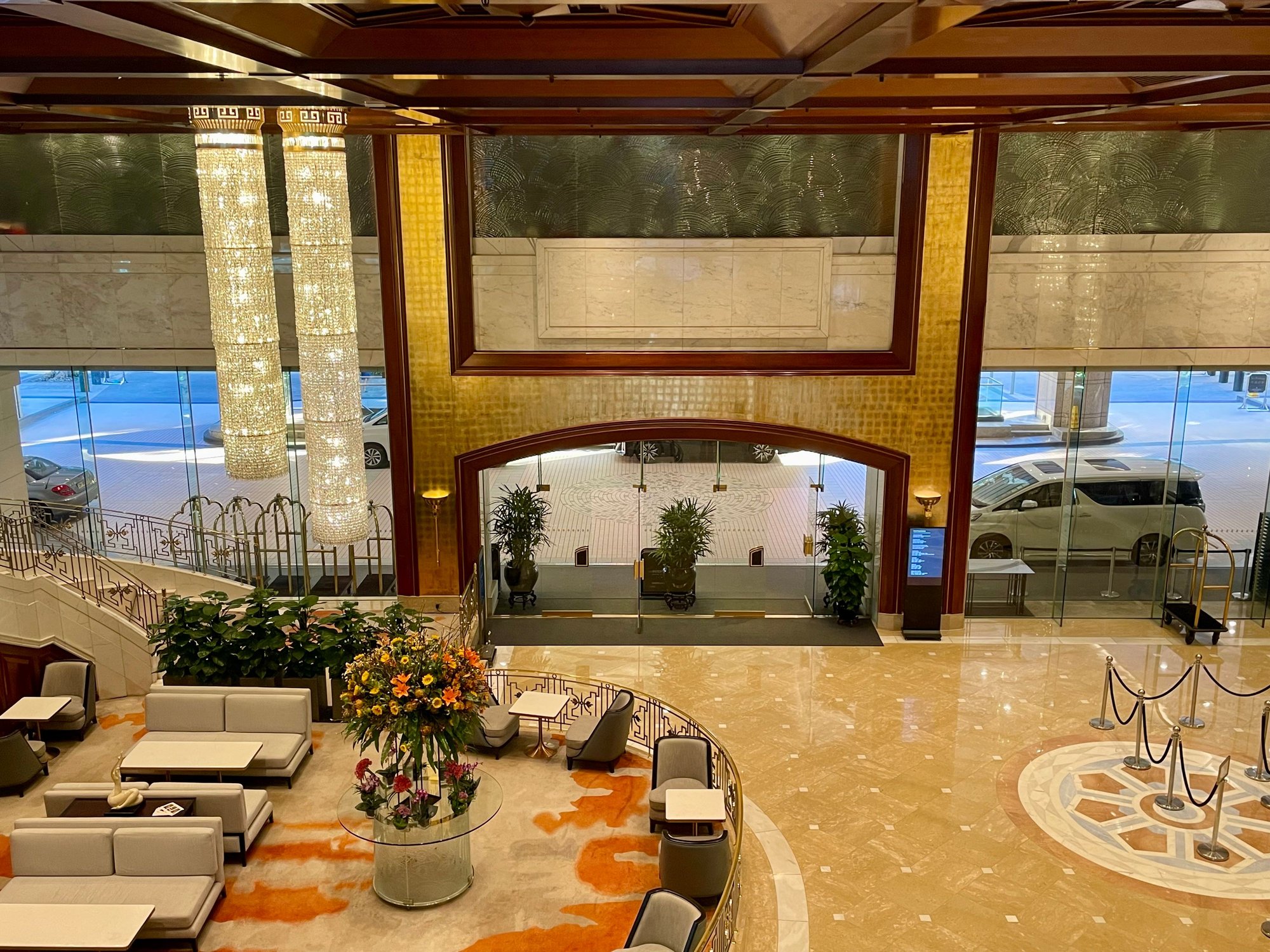 Seating area over the lobby. Dining area in the back with (partial) view over Harbour.