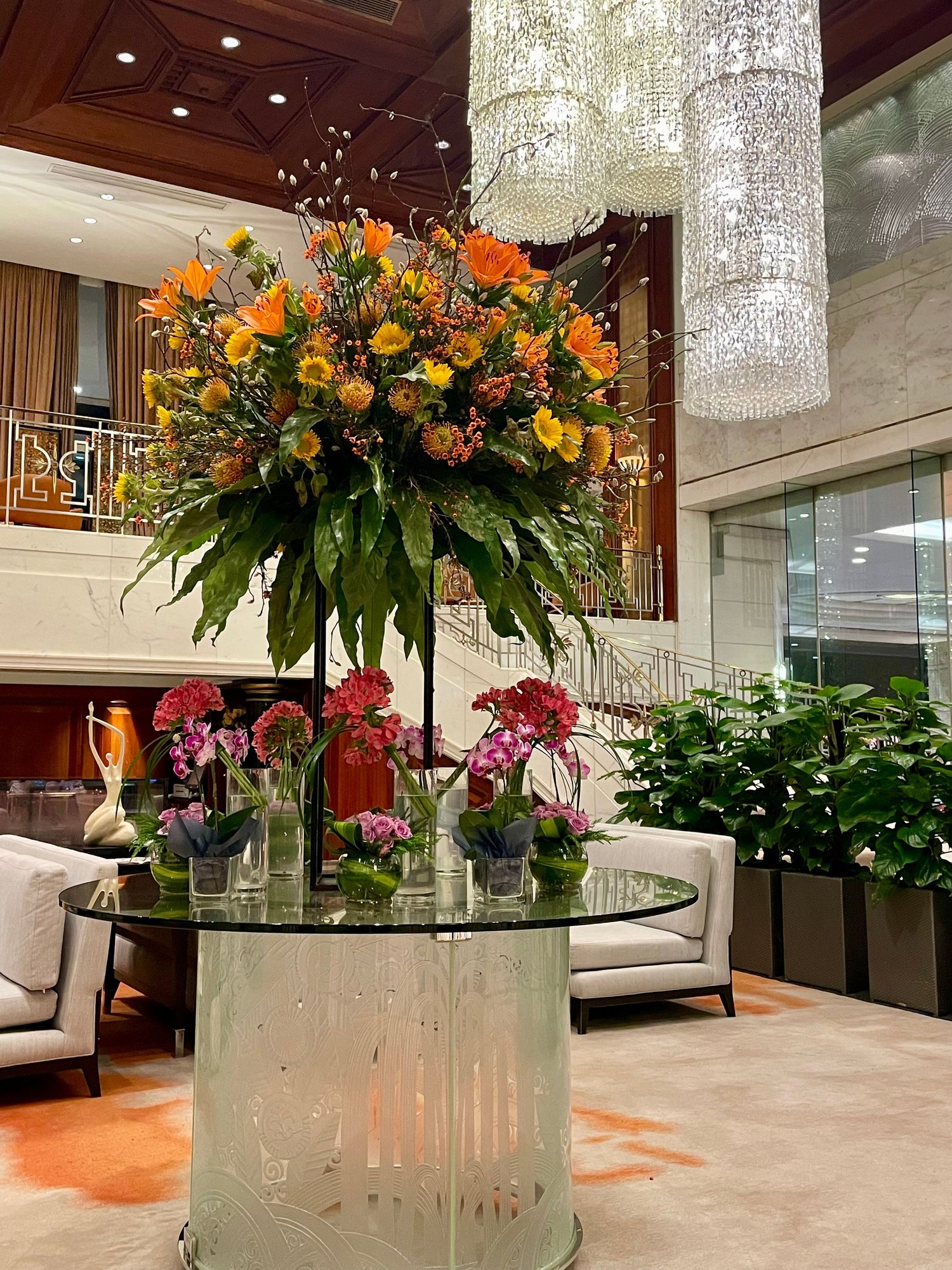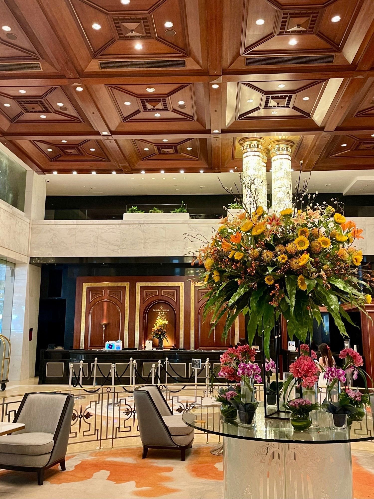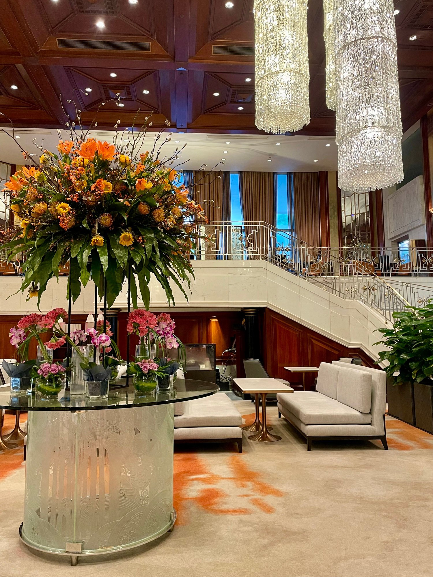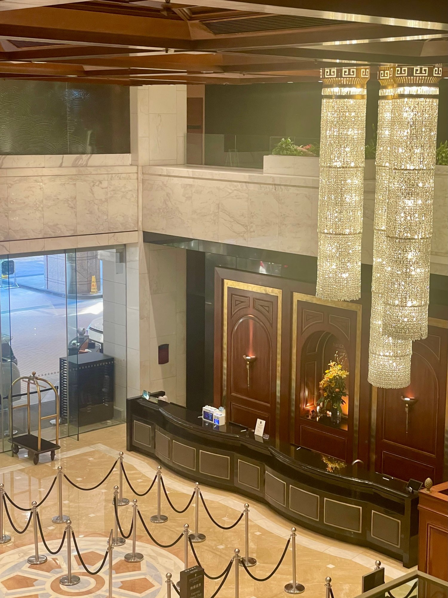 Seating area over the lobby. Dining area in the back with (partial) view over Harbour.