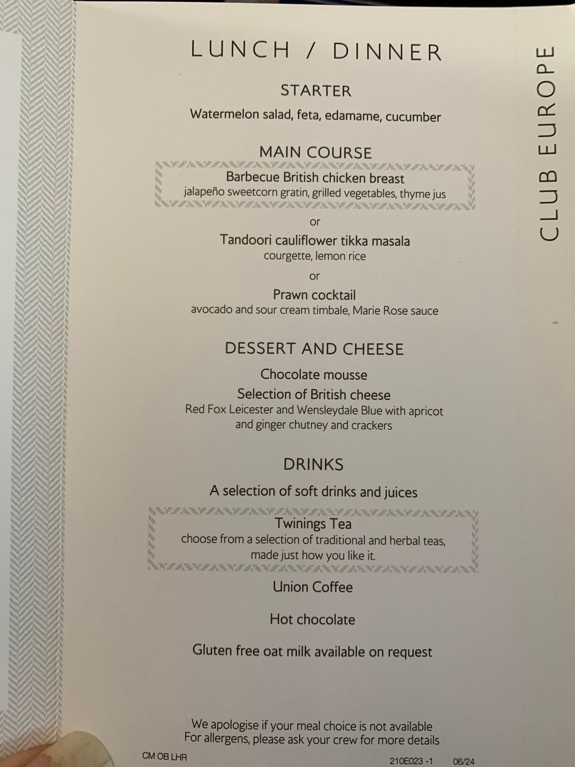 Crew were apologetic about the lack of chicken, and reasonably attentive.