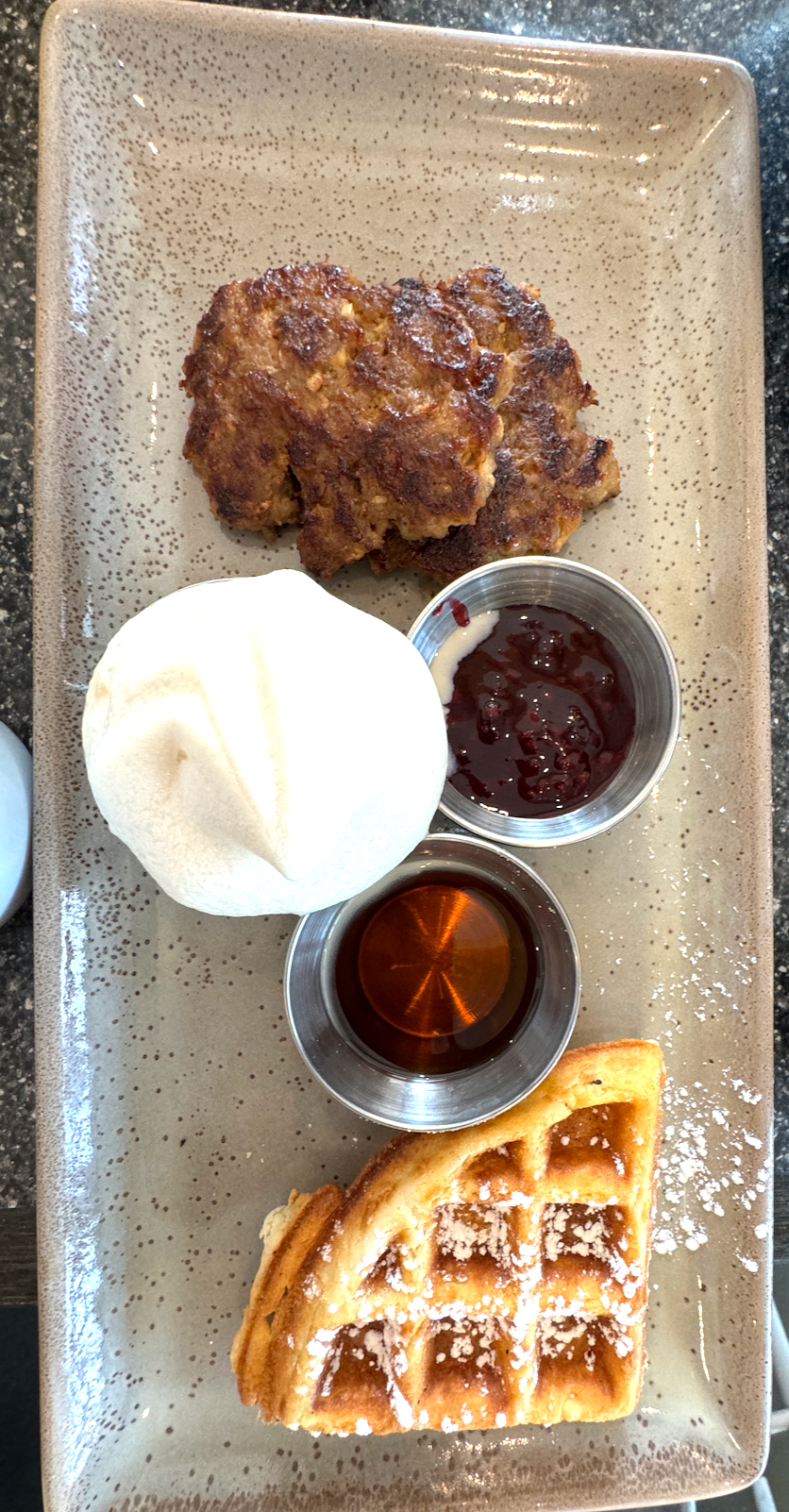 Waffles and sausage. Waffle has berries, maple syrup and whipped cream.