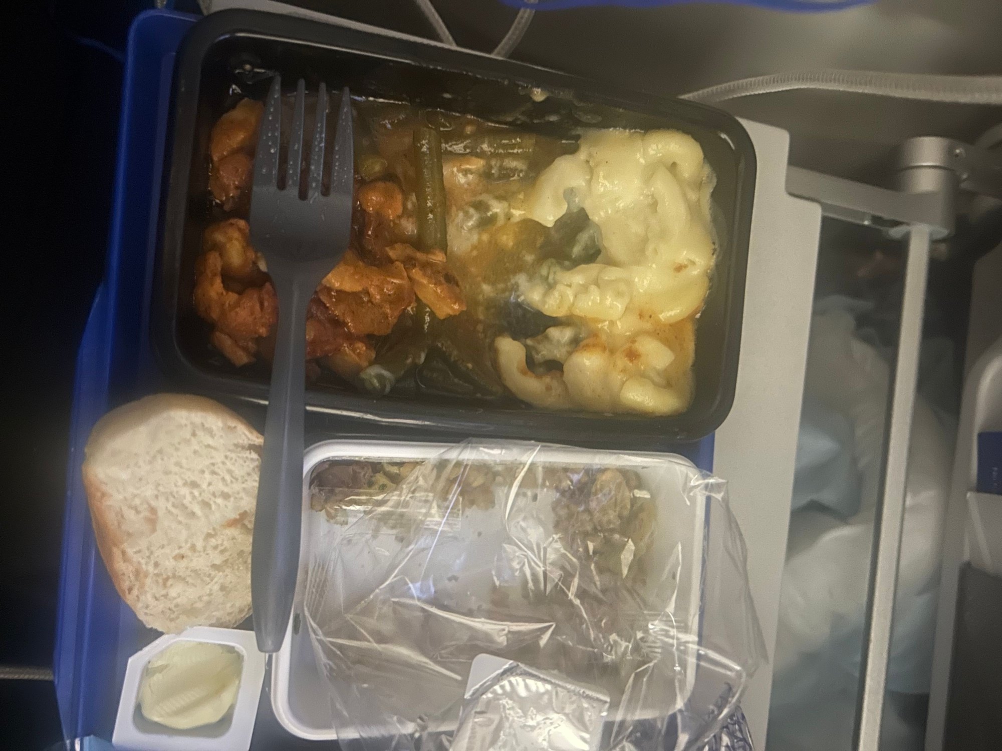 Tasted pretty average to be honest. Mac and cheese reminded me of Chili’s, chicken reminded me of a grocery store food court with an overly sweet sauce that tastes like it came from some sort of bag. Green beans looked frozen (nothing wrong with frozen veggies). Roll was industrial and cheesecake brownie was fine. Overall, a relatively average meal to boot, except for the salad. United needs to get rid of this couscous and raisin thing.