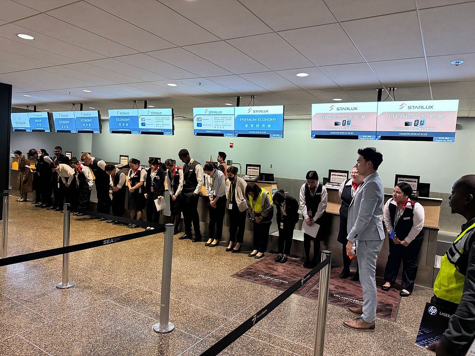 After the station manager gave the check-in team a prep talk, they all stood in line and bowed to passengers before starting check-in early at 9:54pm.