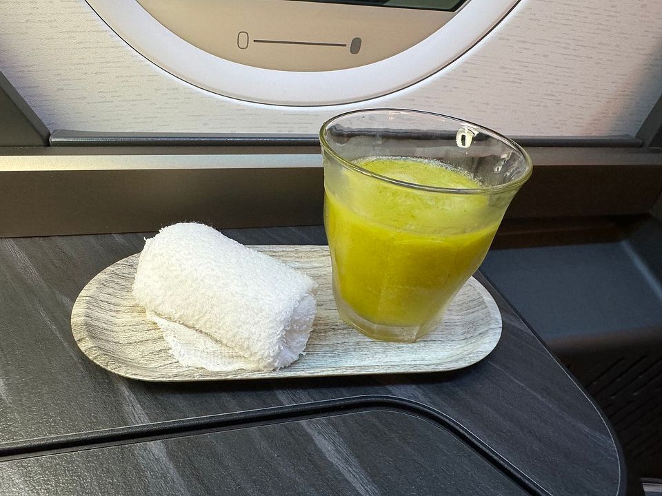 Hot towel and a cold-pressed citrus based fruit juice – Just want to remark that the juice of the day was not orange juice.
