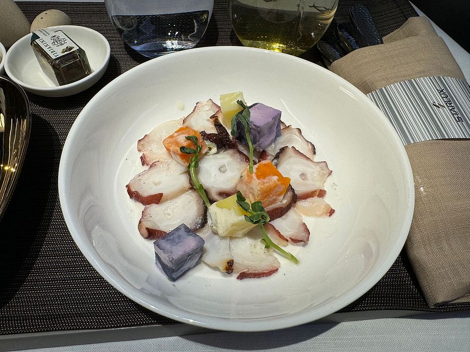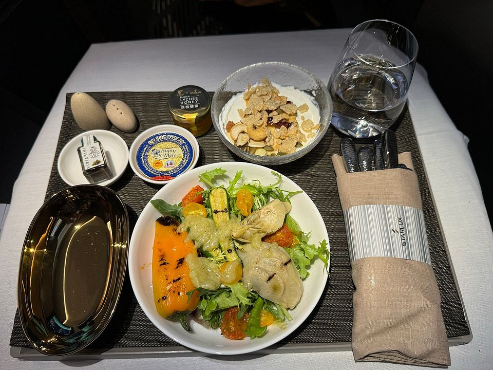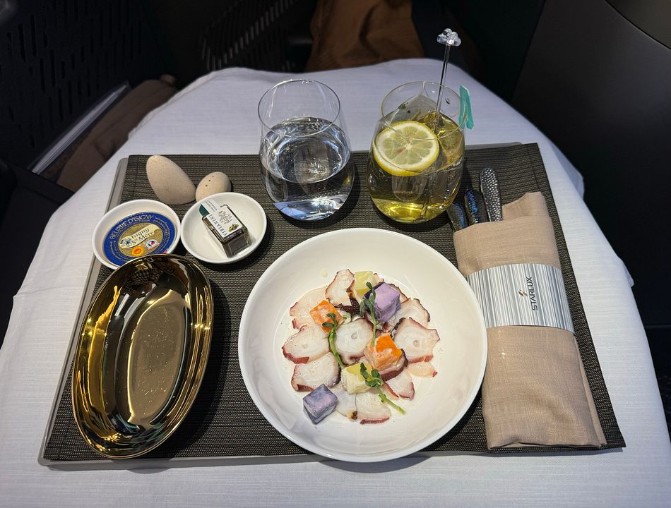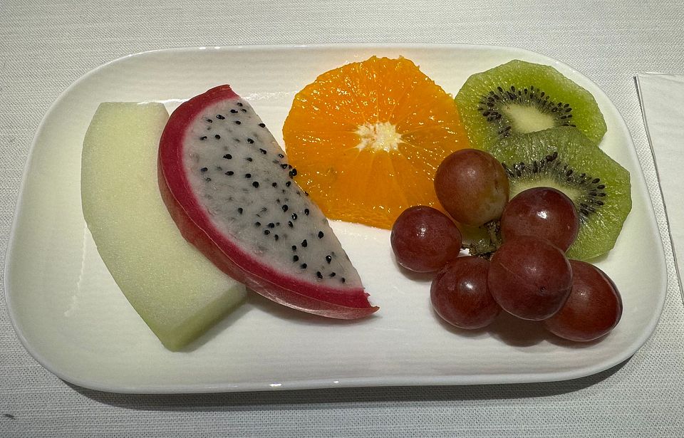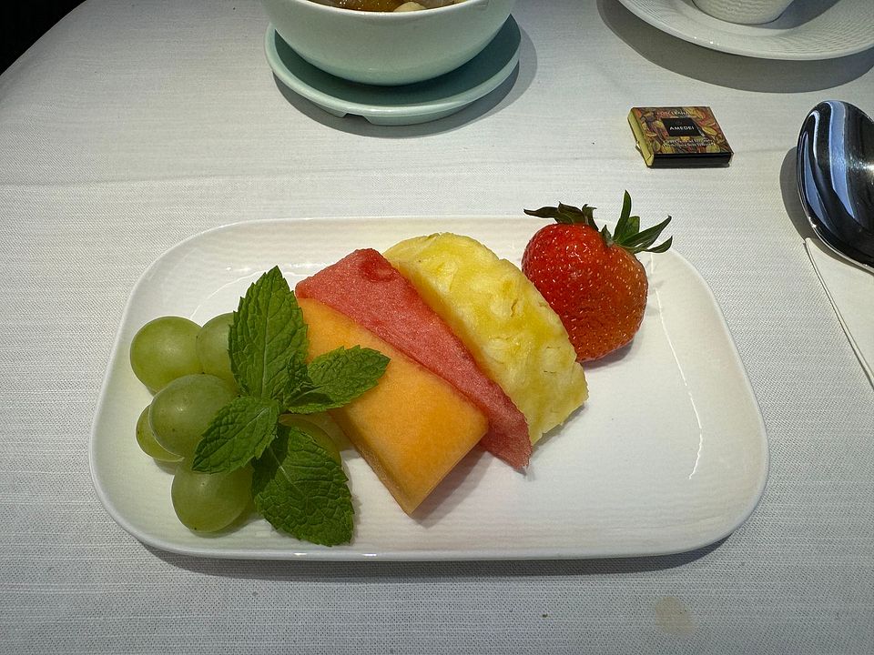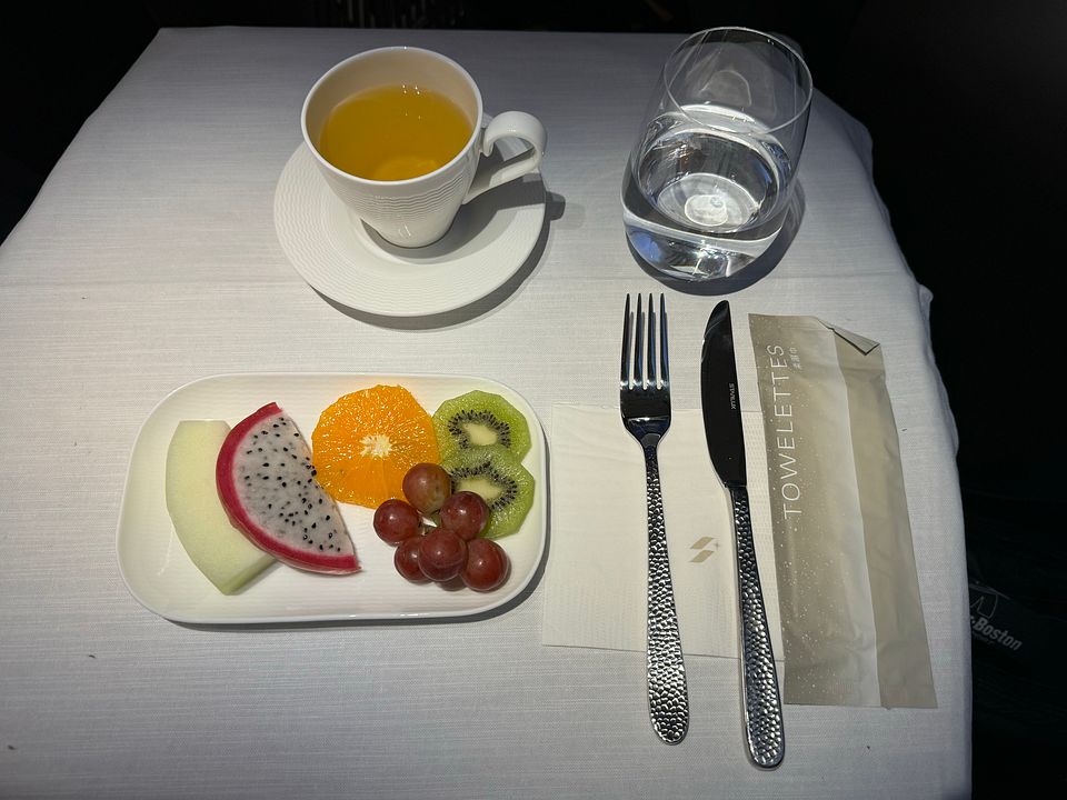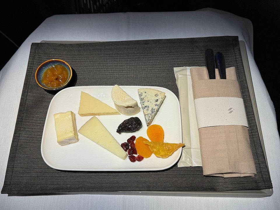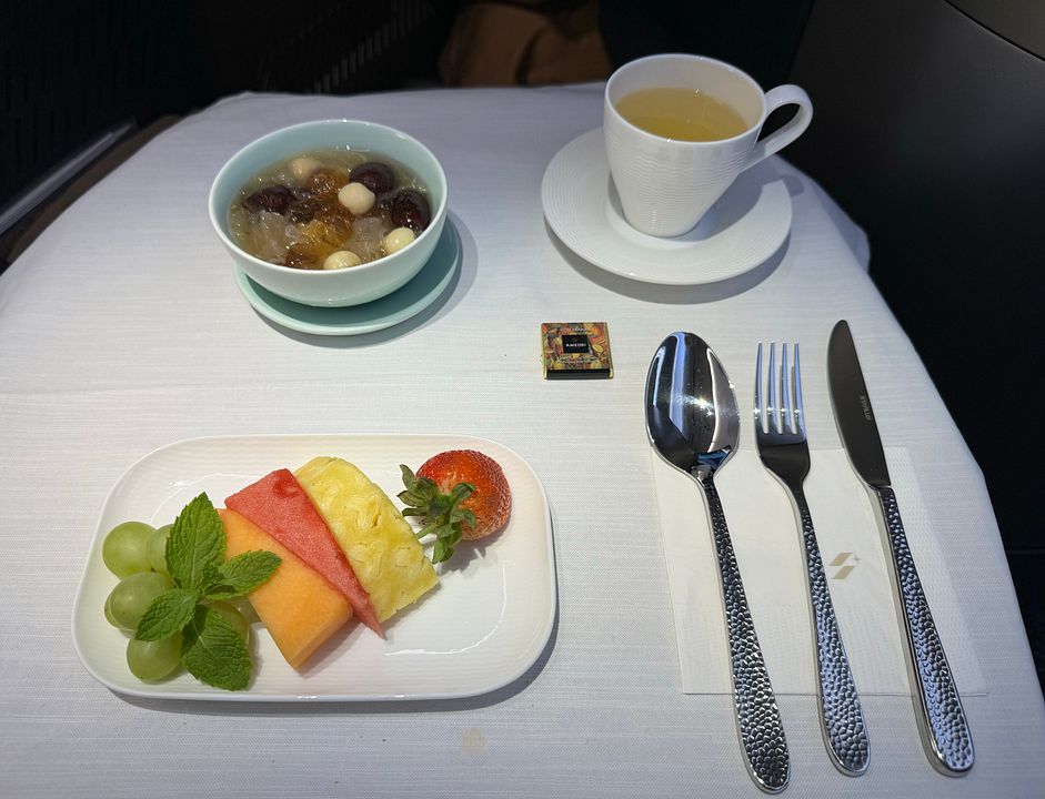 Basically this supper service skipped the beverage and amuse bouche service, and went straight to starter tray with beverage. Then there was a soup service, followed by main course plated individually in the galley. Dessert and fruit service ended the supper service. The service was efficient, as expected for this time of the day (well night). Supper was completed within 90 minutes after takeoff. The food was actually pretty nice and I loved the octopus starter and always preferred a non-cream dressing. The Spinach cream soup was surprisingly good and way better than the Chestnut soup offered on the ex-Taipei flight. I had the beef main course, which was quite nice. Disclaimer I ate mostly lean meat now and preferred my steak cooked over medium. The dessert was the weakest link and I did not eat ice cream, so the Chinese soup was the only choice. Sadly cheese plate was not offered as a choice during the main meal service. My preferred ending to the meal is a cheese and fruit plate.