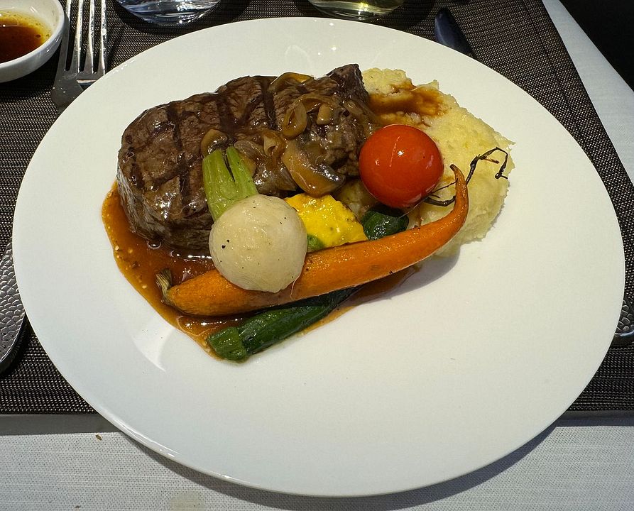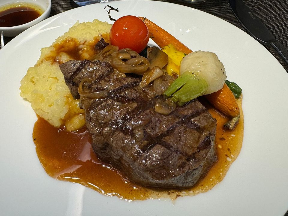 Grilled Prime Tenderloin Beef Steak, Mascarpone Potato Puree, Grilled Vegetables, Bercy Sauce