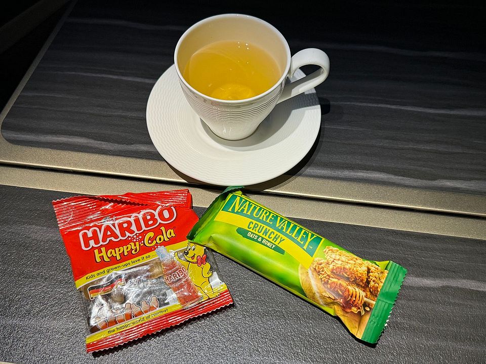 I got a bag of gummy cola and a crunchy granola bar, along with a cup of Oolong tea.