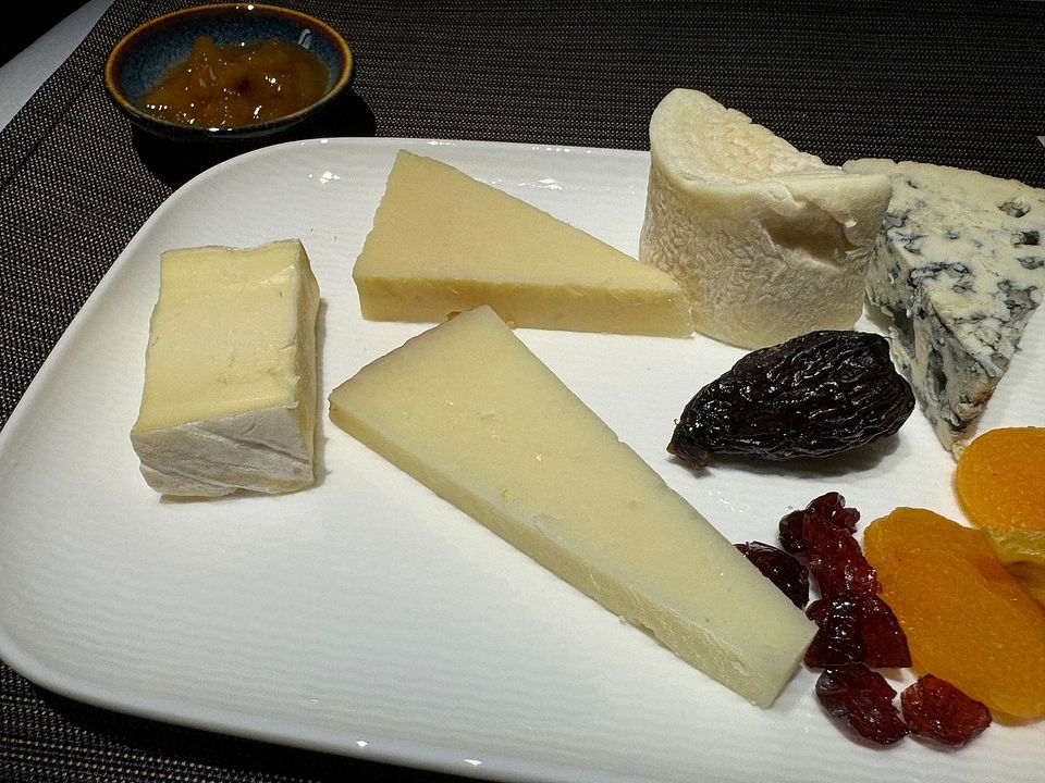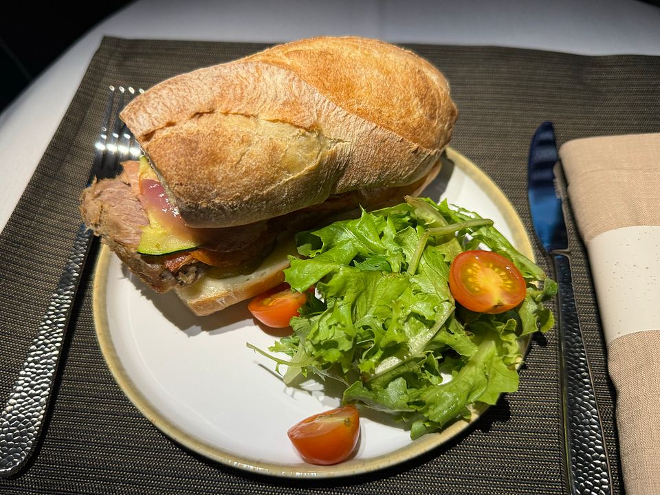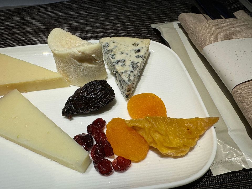 I decided to try the Cuban pork sandwich, which was delicious. The bread was crusty and the meat was good. I just wish it was warmed a bit longer. Then I finally got my cheese plate. They were all good and I only skipped the blue cheese. However, they really need to offer some crackers. I will pack some of my own next time when I will fly their transpacific flight in October. The mango chutney was good too.