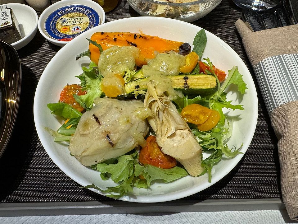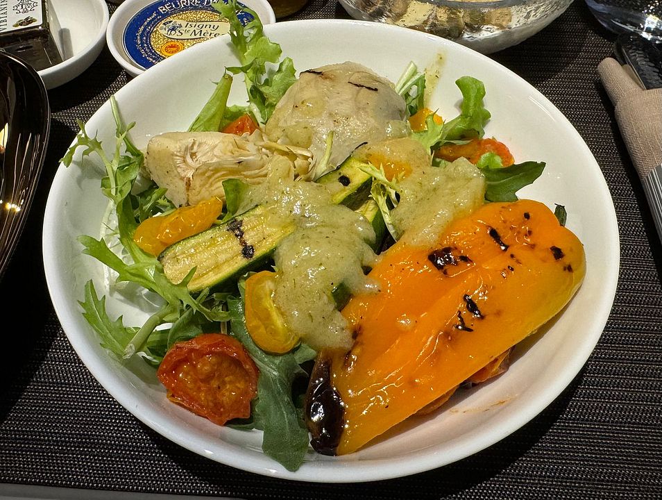 Charred Zucchini and Artichoke, Roasted Sweet Pepper and Tomato, Nicoise Dressing