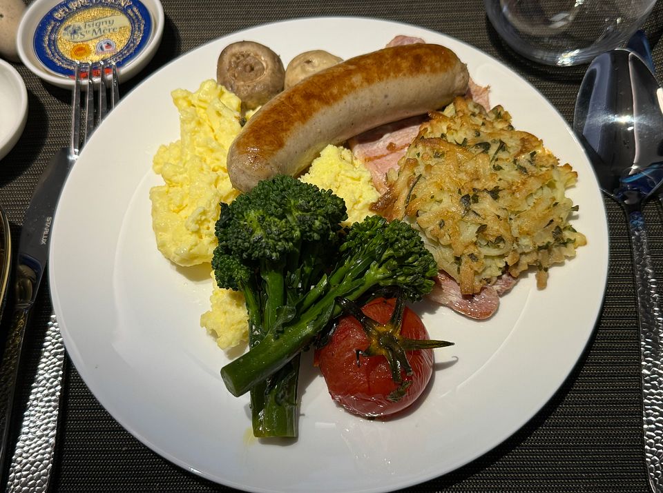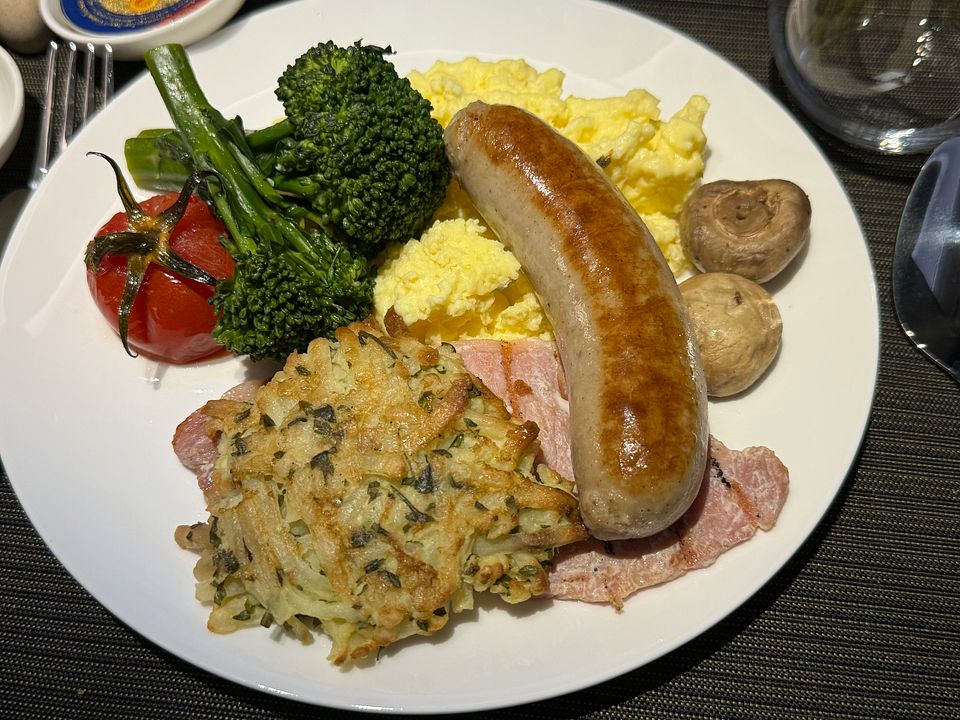 Classic English Breakfast, Banger Sausage and Irish Back Bacon, Scrambled Eggs, Potato Roesti
