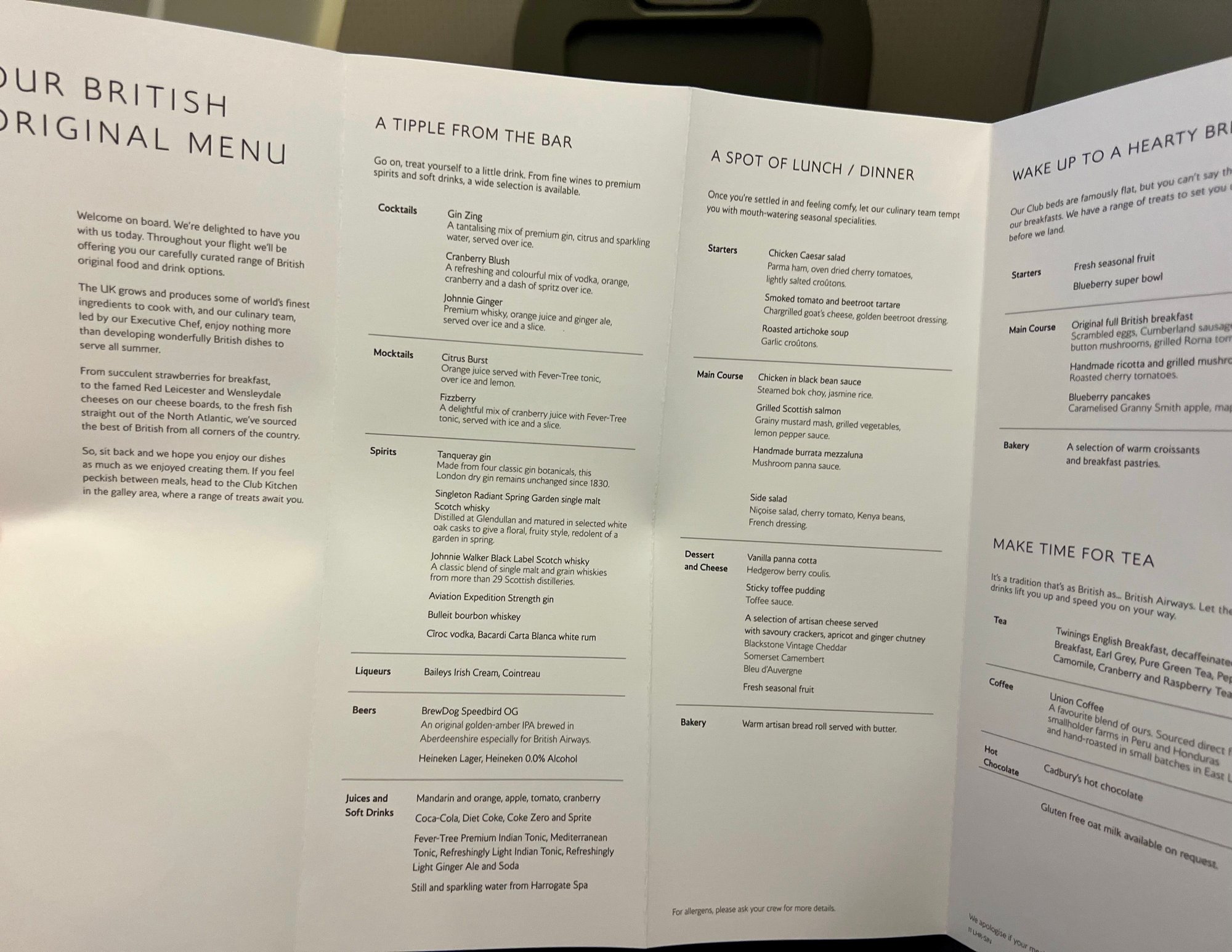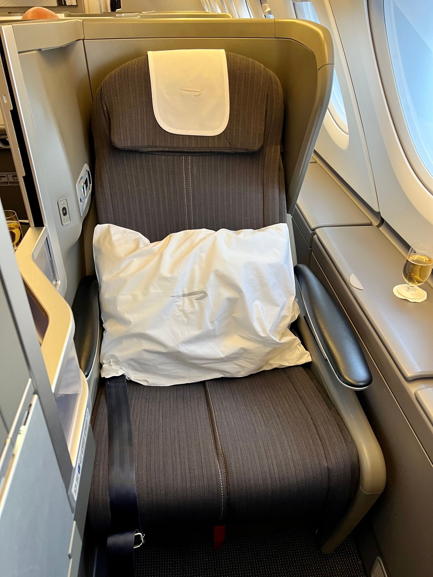 And we’re on board! Tonight we’re in row 59, K and J, which is the last row of Club World seats on the upper deck of this BA A380. The reason for picking these seats was that neither of us would need to “climb” over another passenger, in the event they were sleeping. Seat selection is an optional extra on BA, even in business class. But thanks to my Silver tier status, I could select these for free at the time of booking.