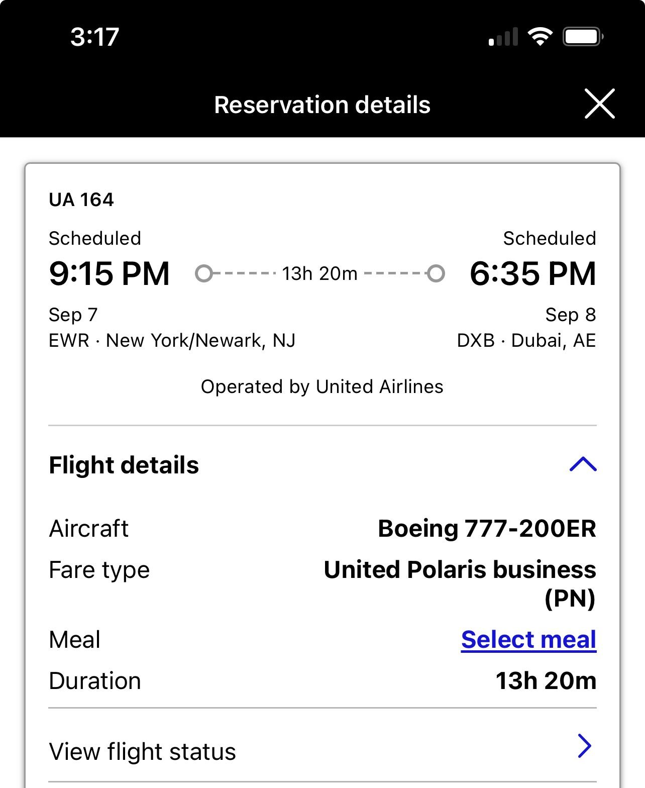 Also, just noticed that for my EWR-DXB flight, "select meal" is linked to the "meal" section of the flight status tab, which when clicked takes you to the menu choices. It's no longer showing as a separate tab in the "Manage your trip" section. Interestingly, though, for my EZE-IAH flight (in 4 days), the "meal" section just says "Meal offered" with no link. See the two pics below.