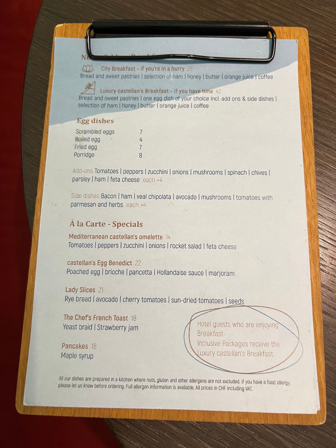 Breakfast was offered as a benefit, but unlike a previous report mentioned, the pancakes/"specialty" menu items were not included for us. It's basically a continental offering with a small station of powdered scrambled eggs and overcooked sausages. Not impressive, but it's free and Switzerland is expensive, so we were happy.