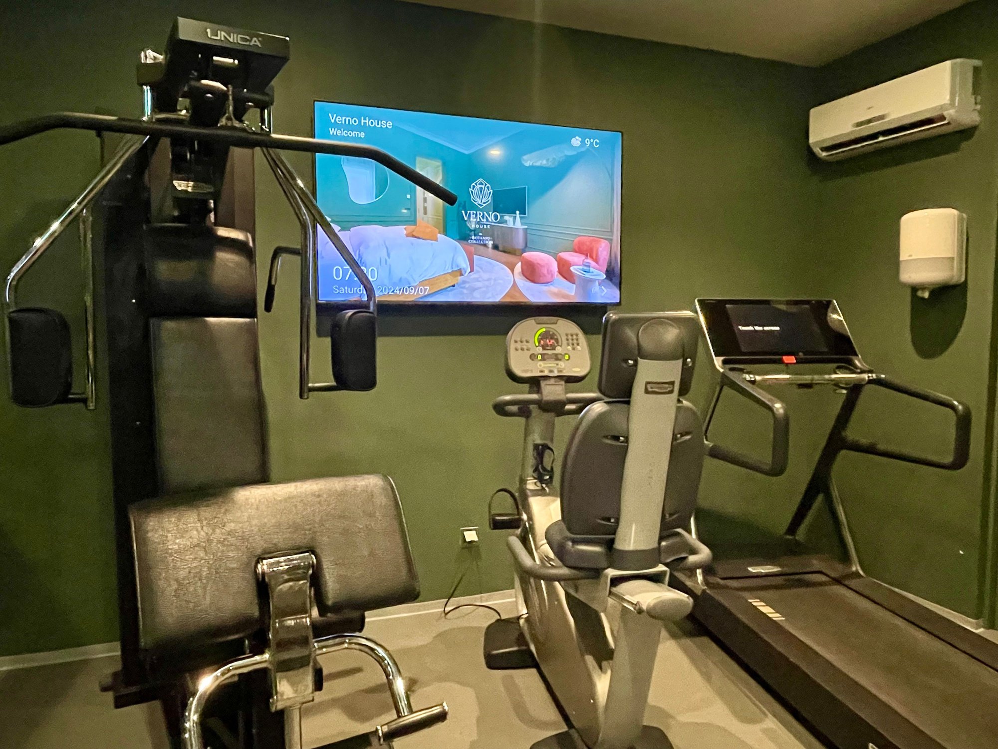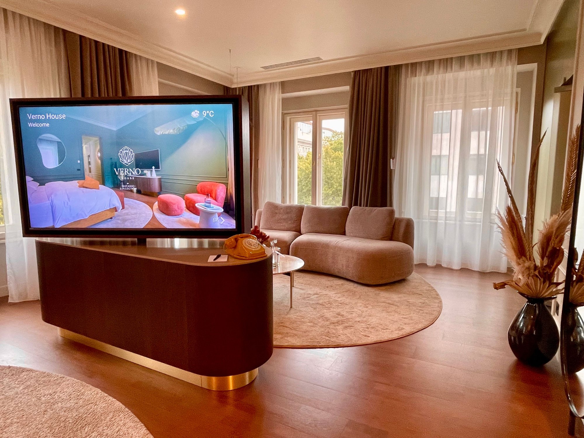 Massive swivel television with good selection of international channels. Direct Apple TV and Netflix access..