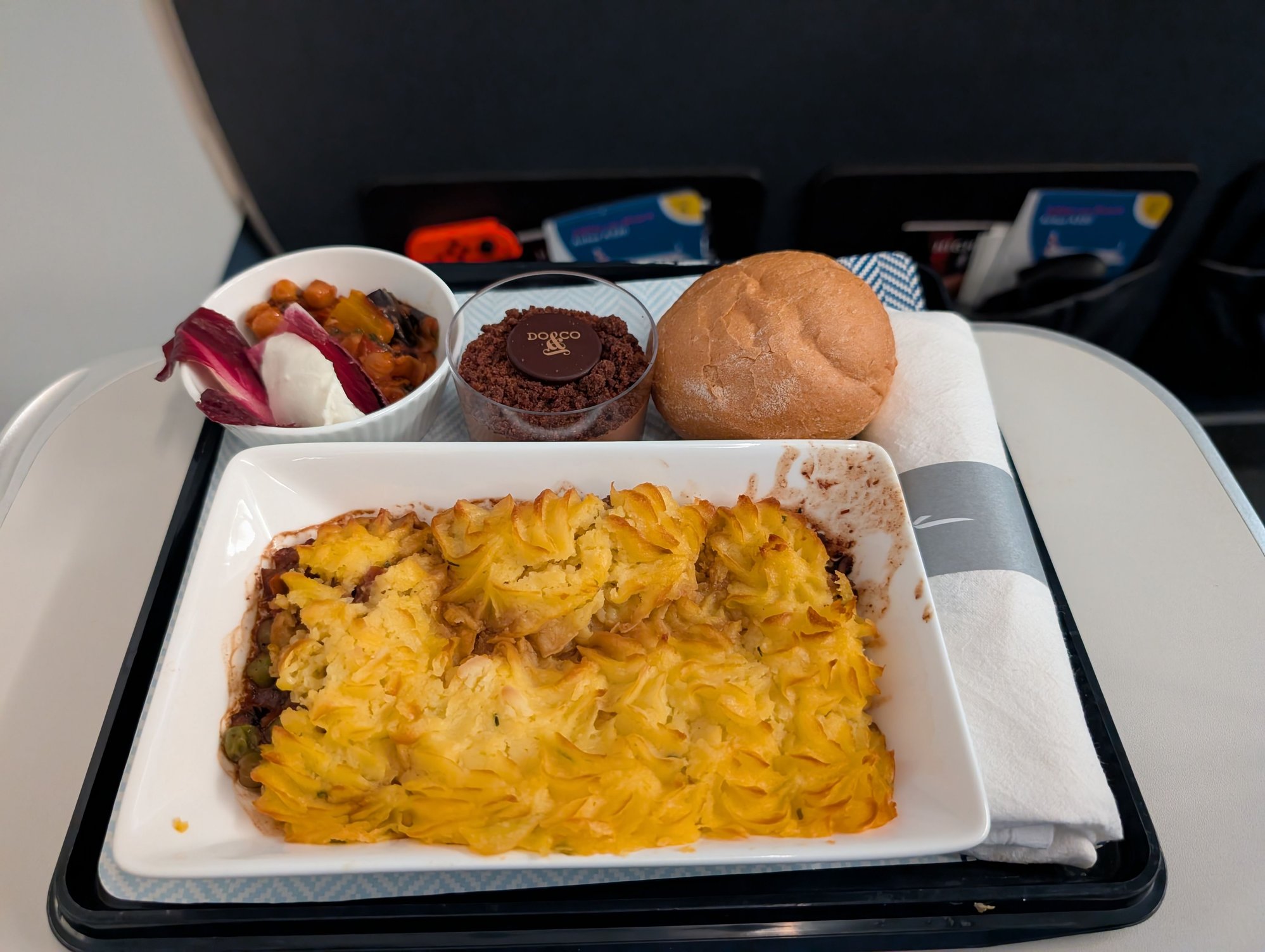 LHR-VIE evening flight. No menus but verbally described as shepherd's pie (below - I'd rate it 9/10), courgette fritter or salmon tartare. One of my friends went for the latter, it was essentially the same as I posted above in