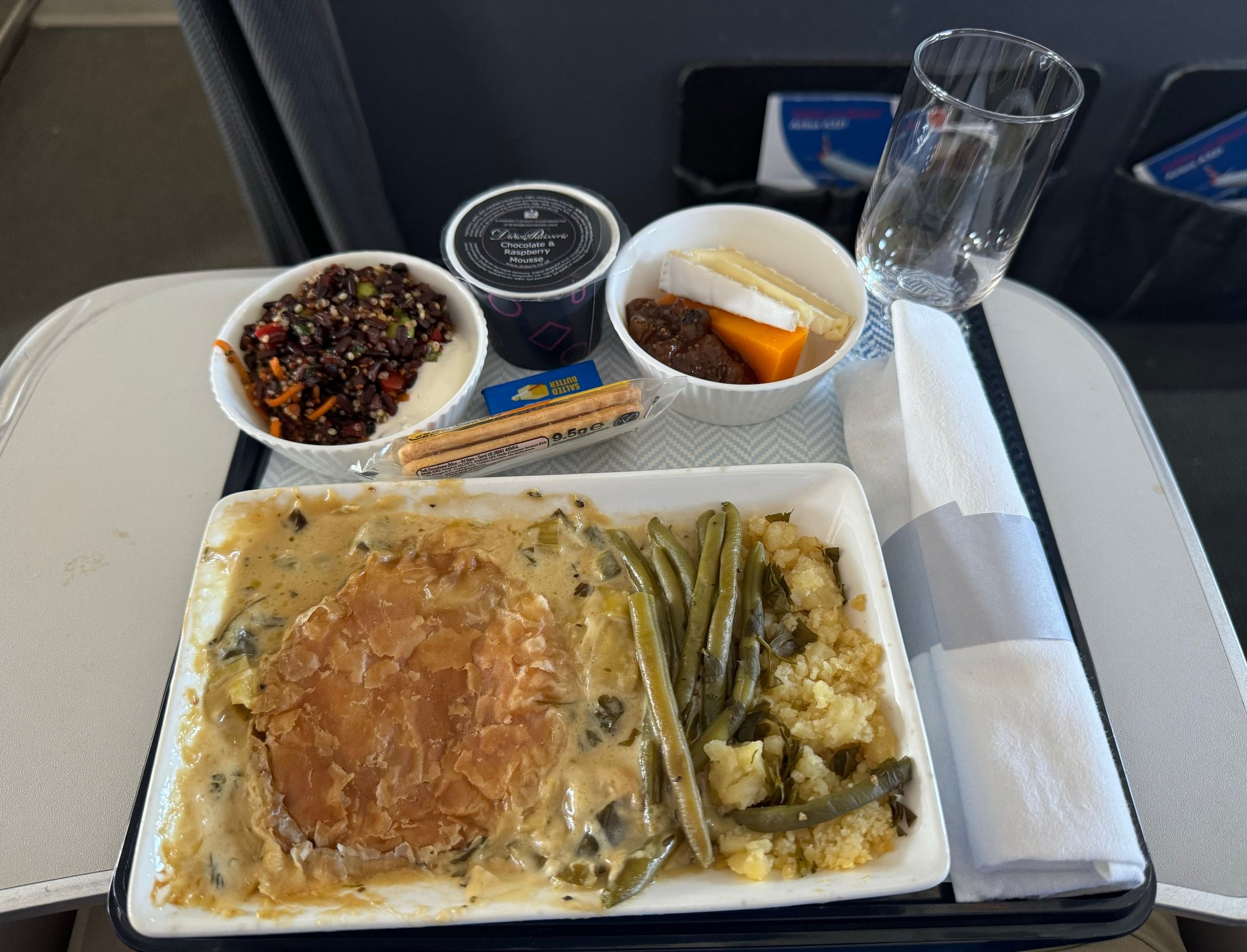 Leek and mushroom pie, Malaga to Gatwick yesterday. It’s not a looker, but it’s really tasty and I say that as a meat eater and I actively chose this instead of the chicken. The starter was some sort of grain salad (I lost the menu) - chocolate and raspberry dessert pot, cheese, Jacob’s crackers and Cornish butter. Good crew, plenty of drink top ups and proper offering of hot drinks (rather than leaving it ‘on request’ as sometimes seems to be the case). Those Gatwick A321s are looking really tired though - filthy carpet, tattered literature pockets and bits of the trim held on with tape.