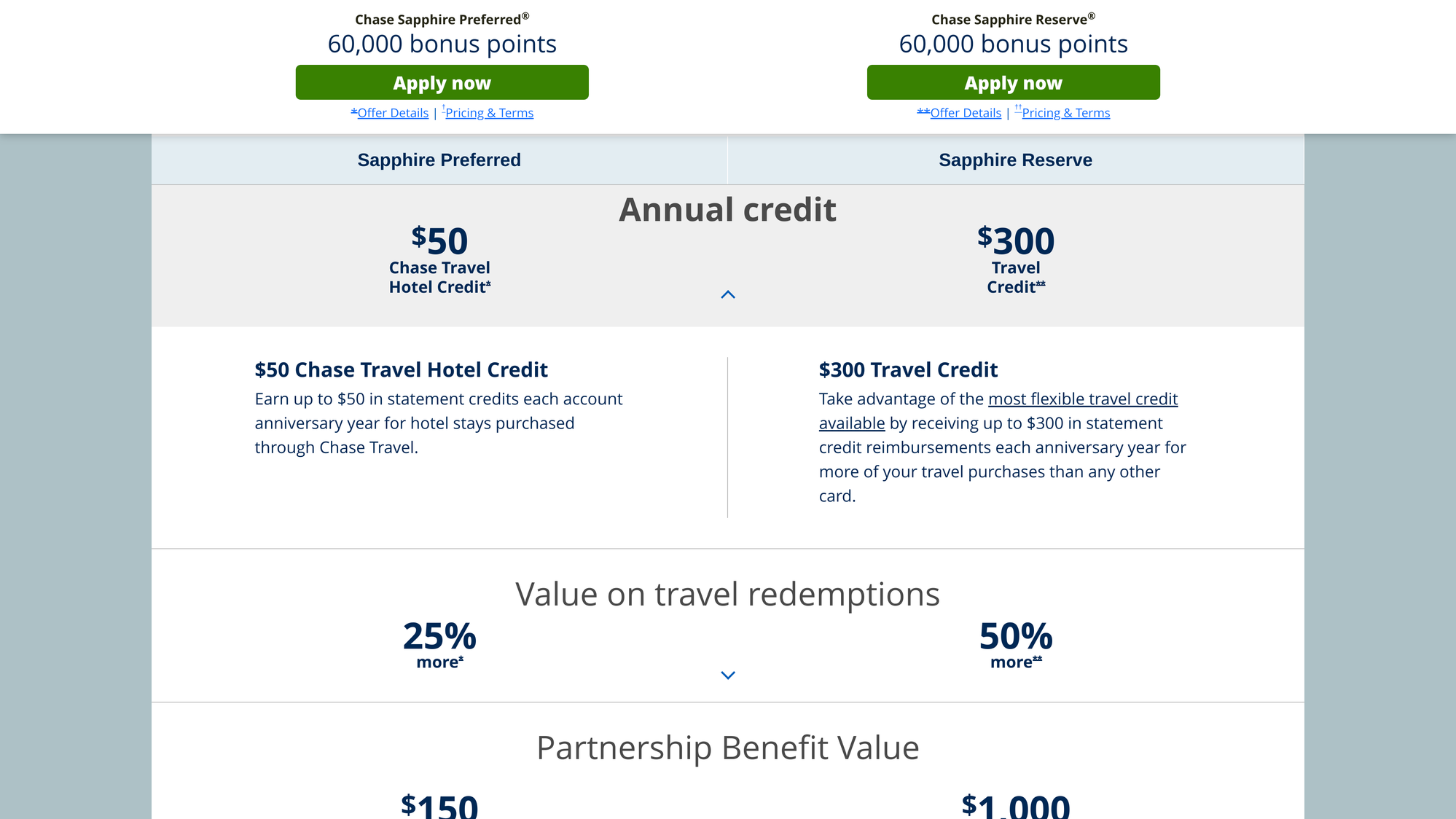 Sapphire Reserve offers the $300 Travel Credit. Sapphire Preferred offers only the $50 Chase Travel Hotel Credit.