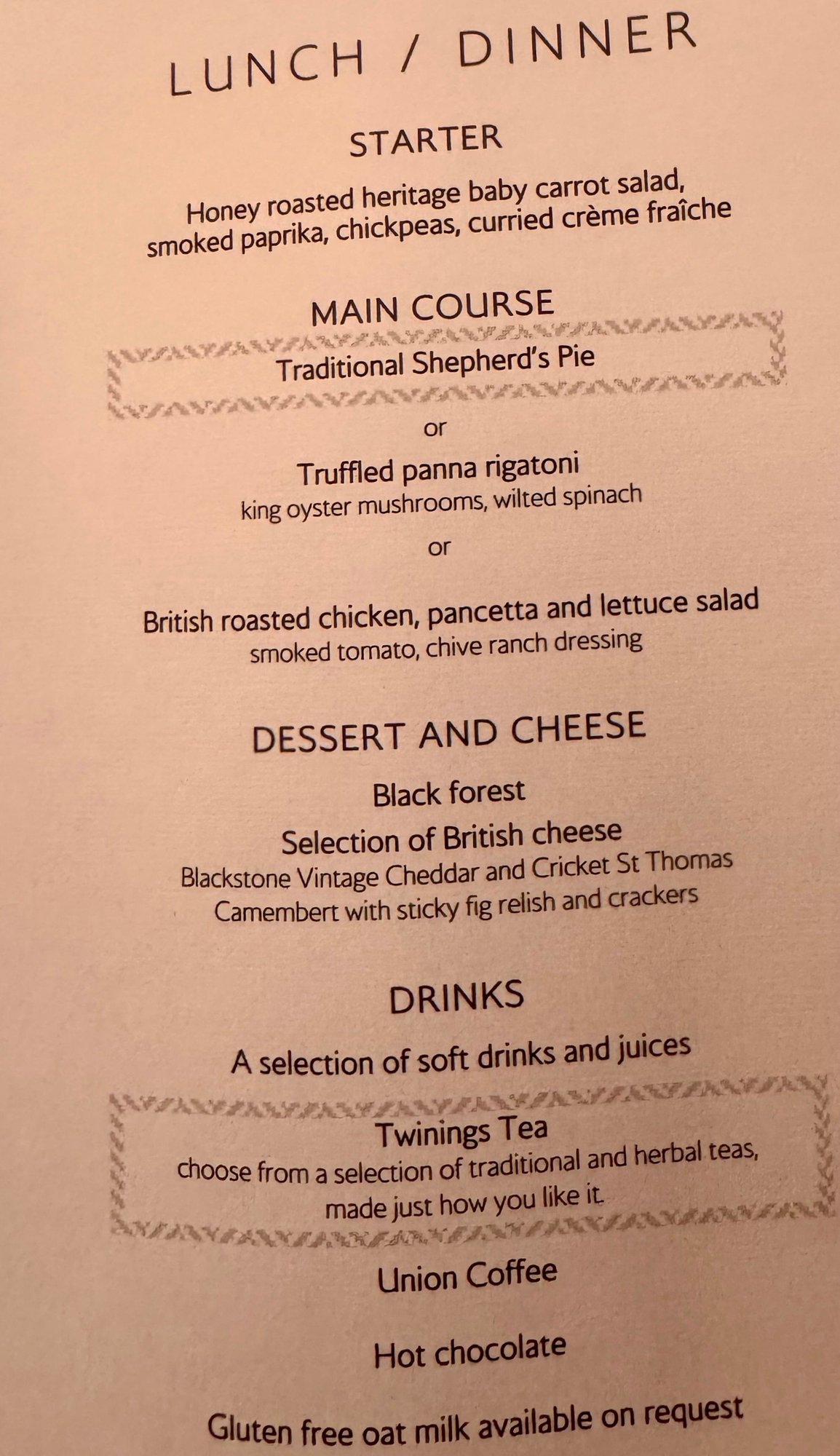 They did run out of Cottage Pie well before our seats in Row 11, not a total surprise but the Rigatoni (Pasta) and Chicken Salad were both enjoyed
