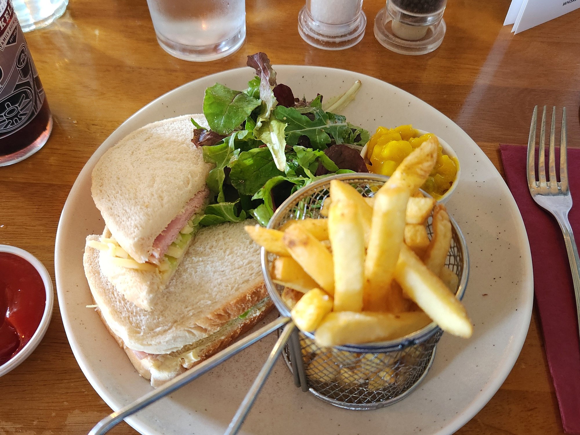 I went with a ham and cheese sandwich with chips. It was really good. It had some amazing cheddar cheese on it that really hit the spot.