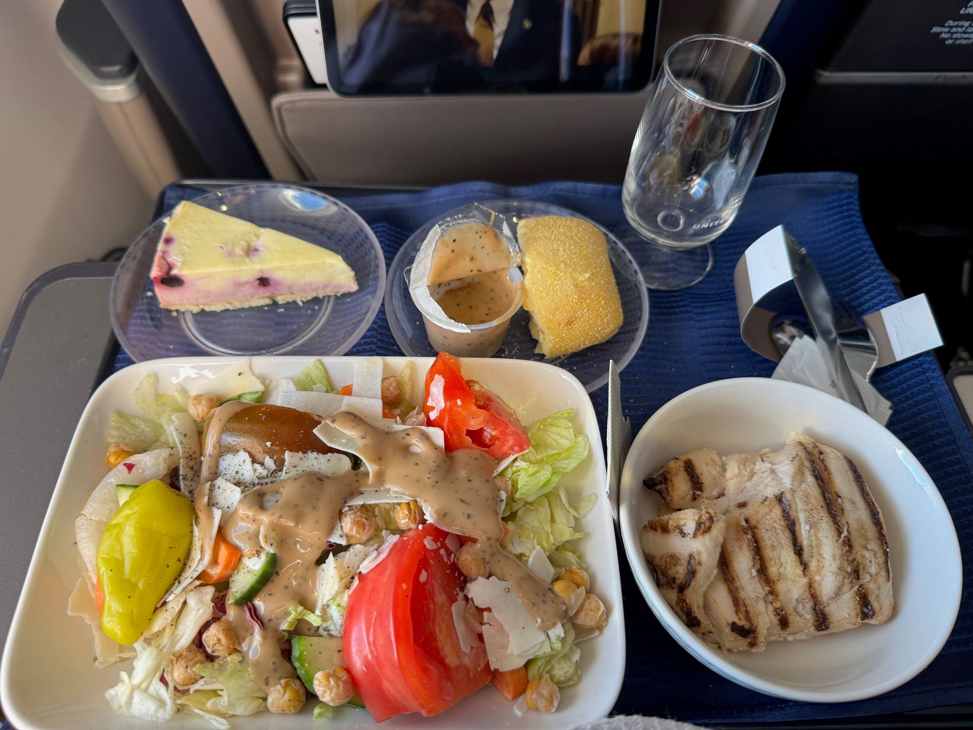Preorder worked. Hot towels then Nuts and drinks first. Nuts were genuinely hot, and came with a warning. I had the salad with grilled chicken. Unlike other photos I've seen here, it was iceberg lettuce, which was the only disappointment. The veggies were crisp and tasty. The tomatoes were actually good, maybe the first time I've had a good tomato on an airplane. The chicken tasted good and wasn't dried out. The roll was typical but rolled in corn meal or something so it had a rough texture and corn taste on the outside. The blueberry cheesecake was delicious. The improvement trend continues.