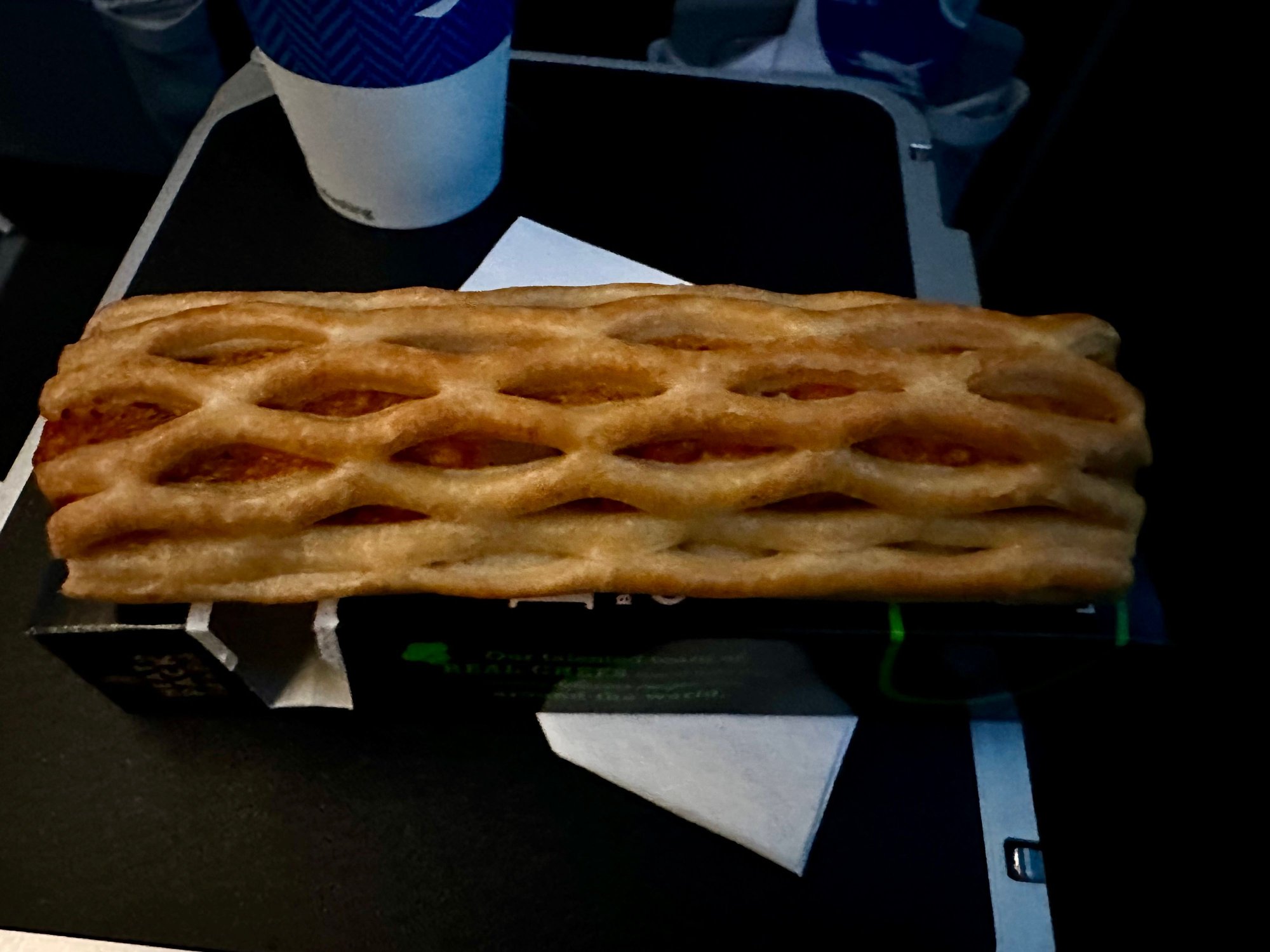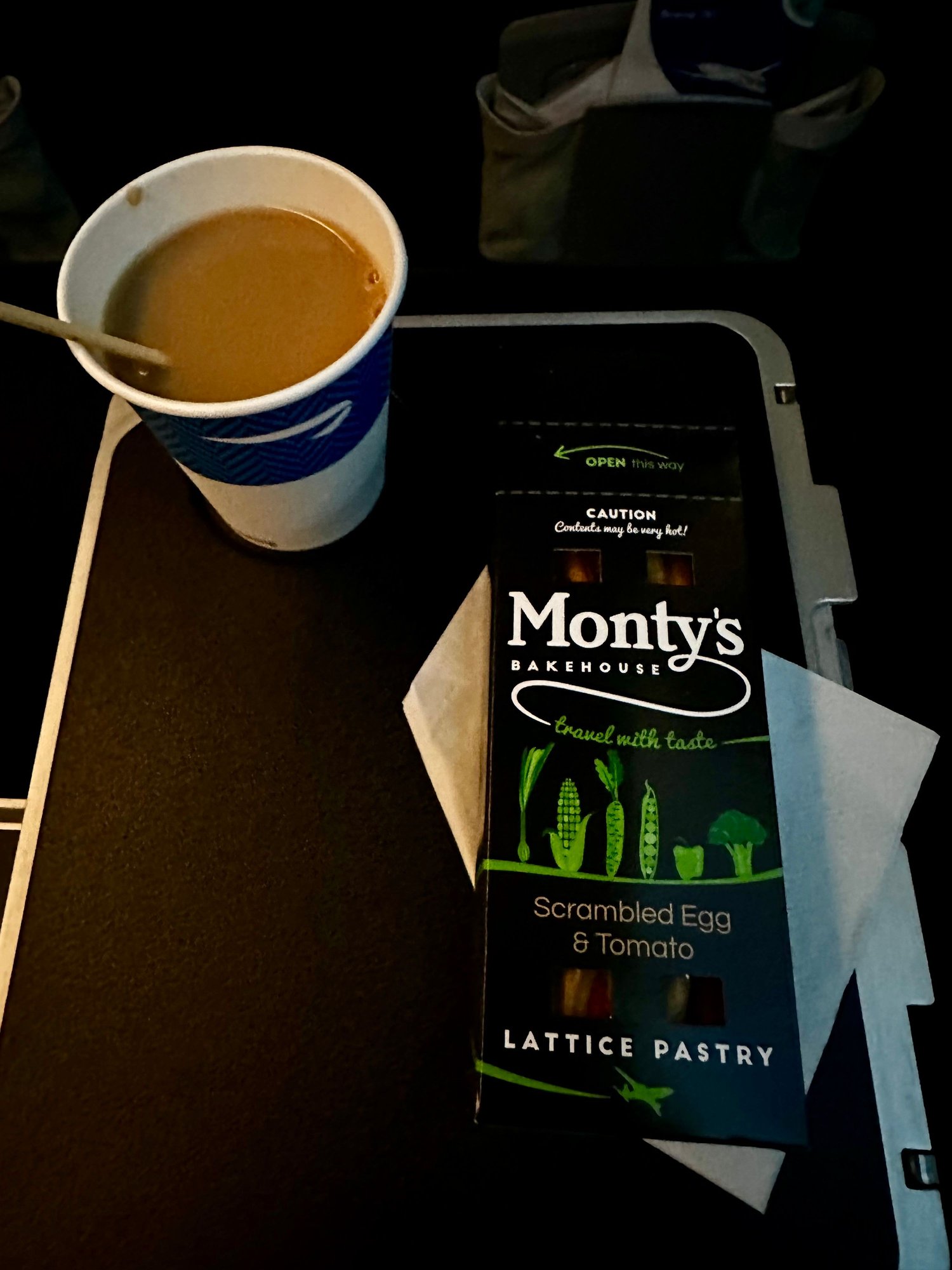 With an hour to arrival the lights were raised and the snack was distributed. The scrambled egg and tomato pastry was disgusting and one bite was more than enough.