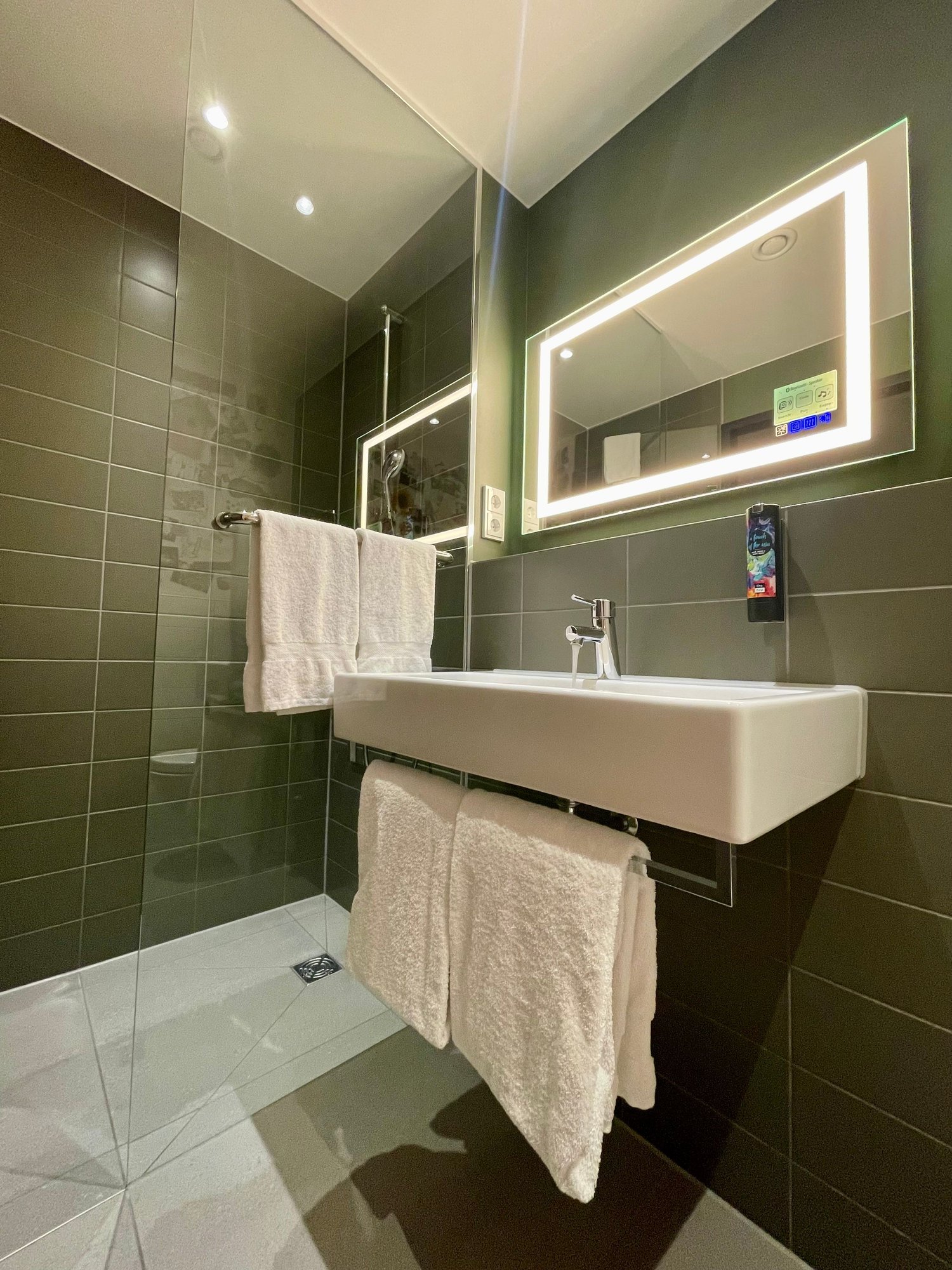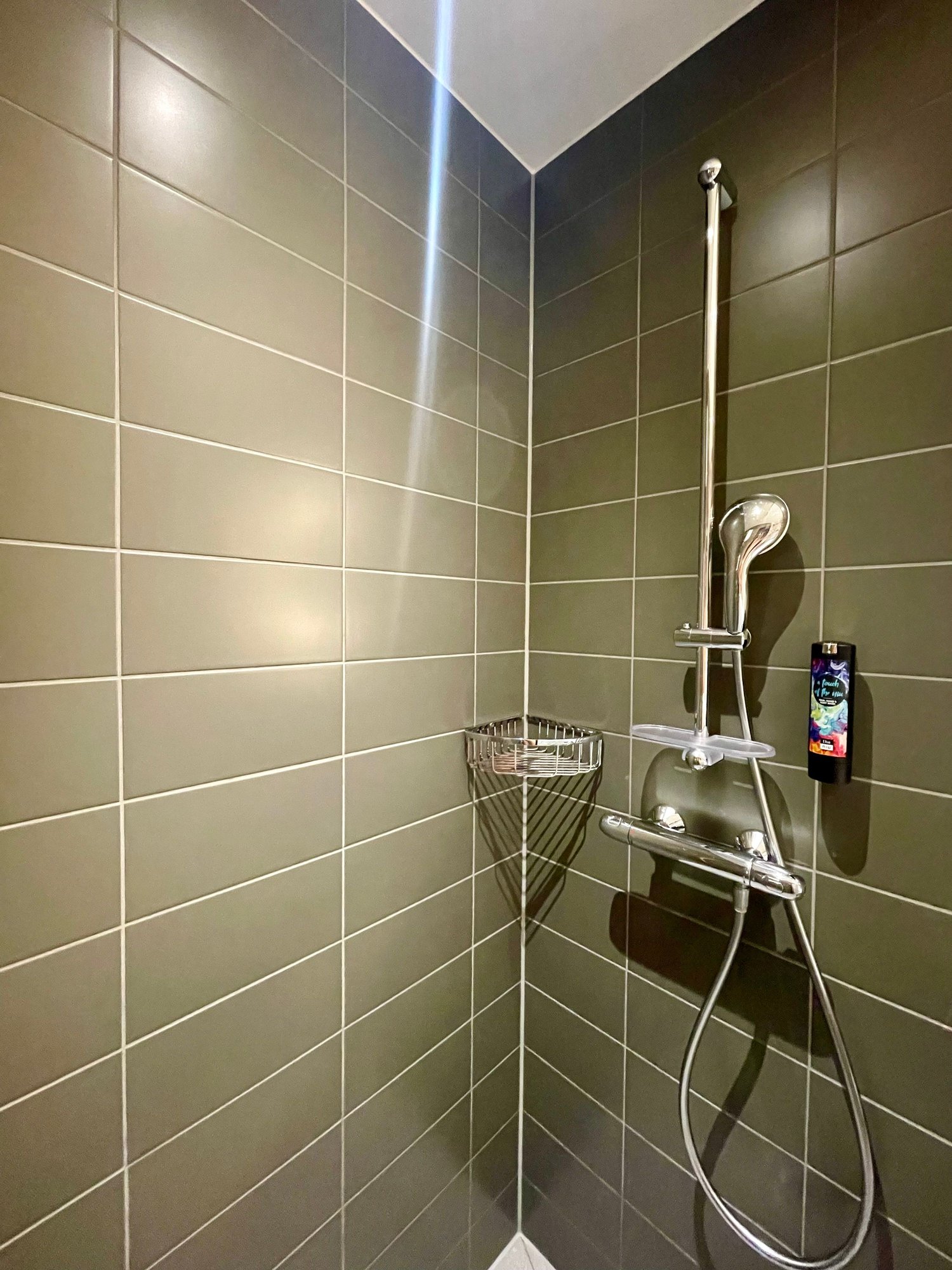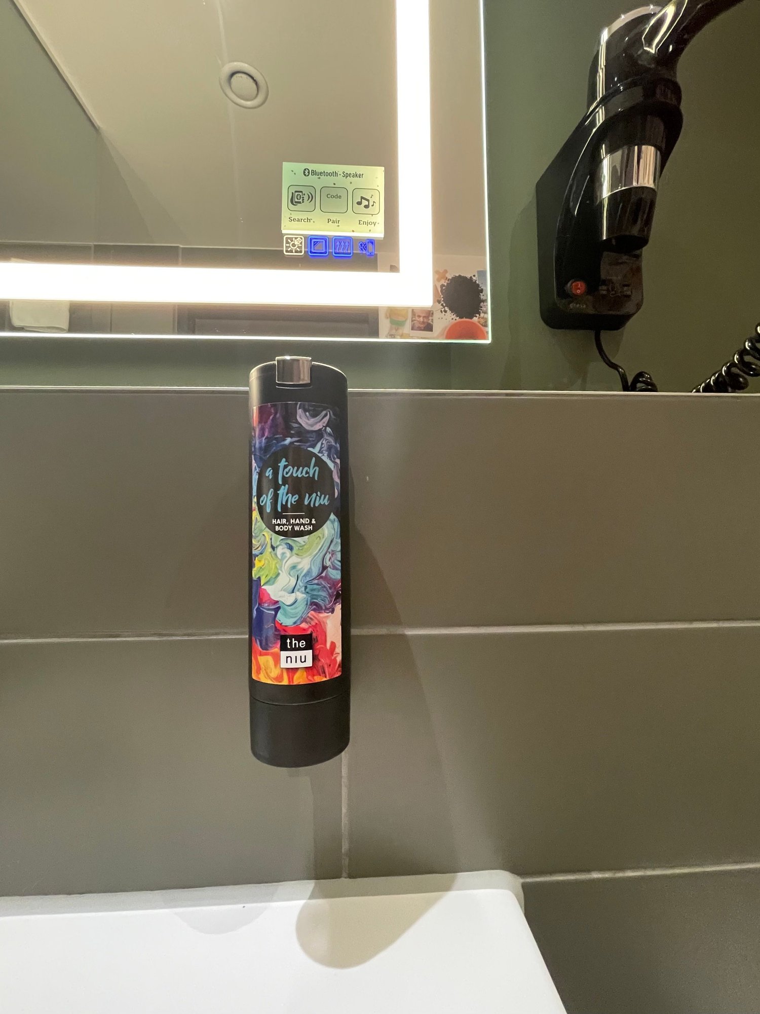 Niu branded toiletries (whose rather disgusting fragrance is somewhere between cheap multivitamin fruit juice and children's medicine). Only a single dispenser for shampoo/shower gel. No conditioning shampoo. No tissues.