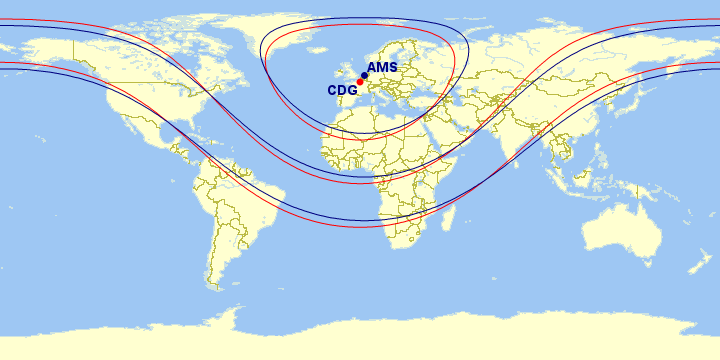 I have never seen a map of flight distances from CDG or AMS. It allows to see which destinations fall in different categories according to FlyingBlue (medium, long 1, long 2, long 3). I share a map of my own and I hope it can be useful to other travellers!
