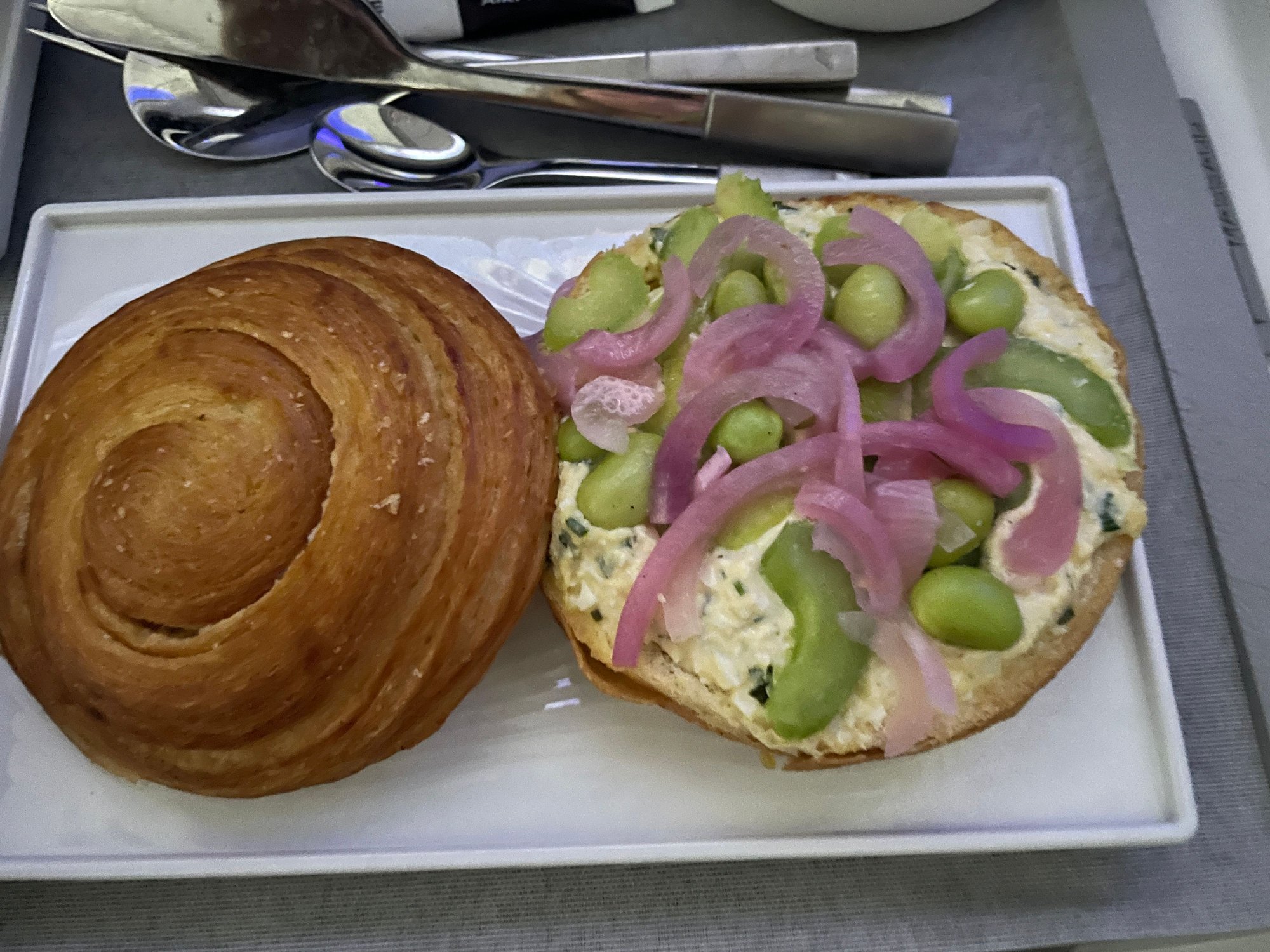 Brioche with egg and mayo topped with fava beans and pickled onions
