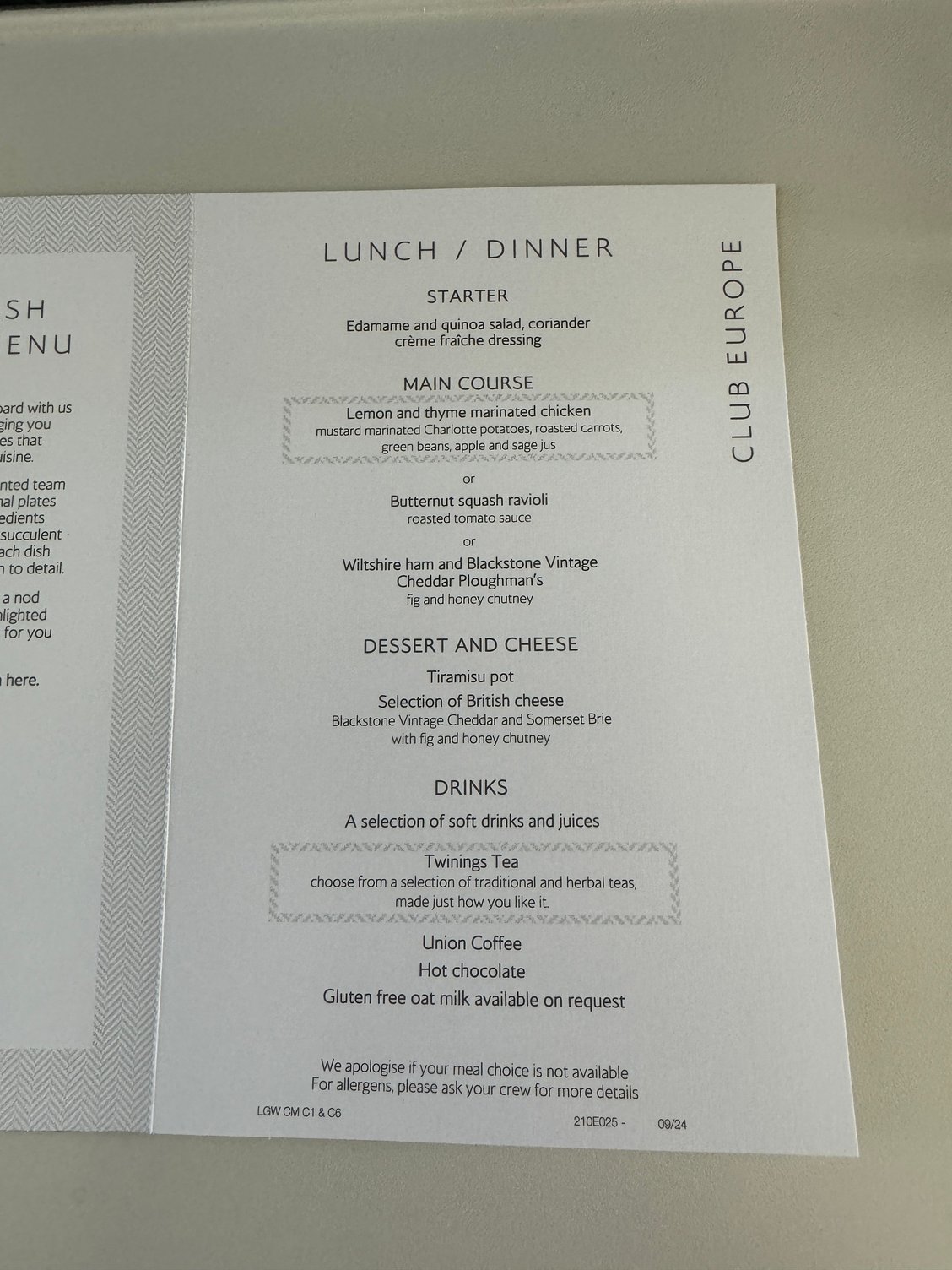 I was in row 7 of an 8 row CE cabin. Unfortunately they’d run out of the chicken so I went for the ploughman’s. Big mistake!
