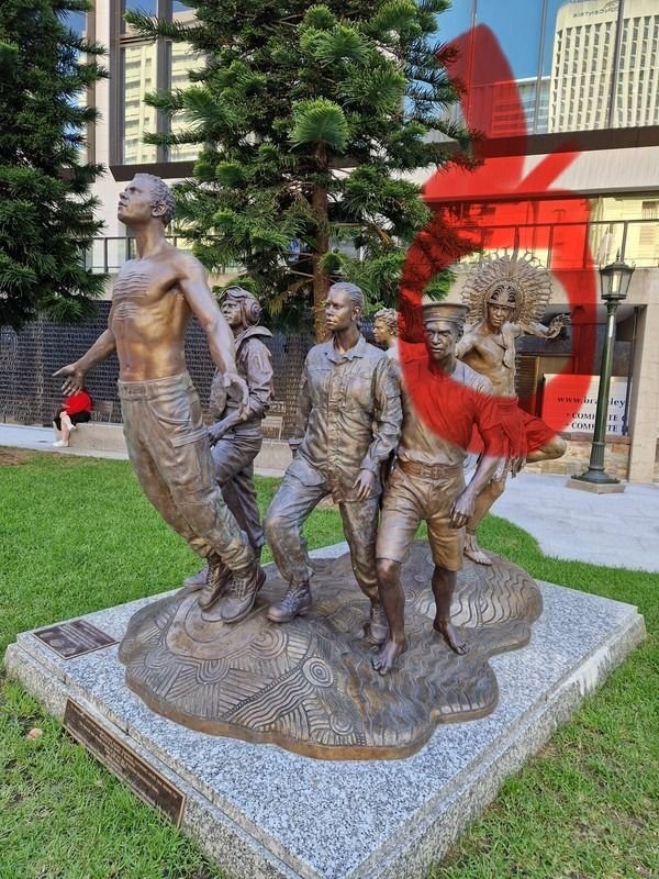 the highlighted chap in this statute is wearing a Dhari which is the symbol in the middle of the previously discussed Torres Strait flag, FYI
