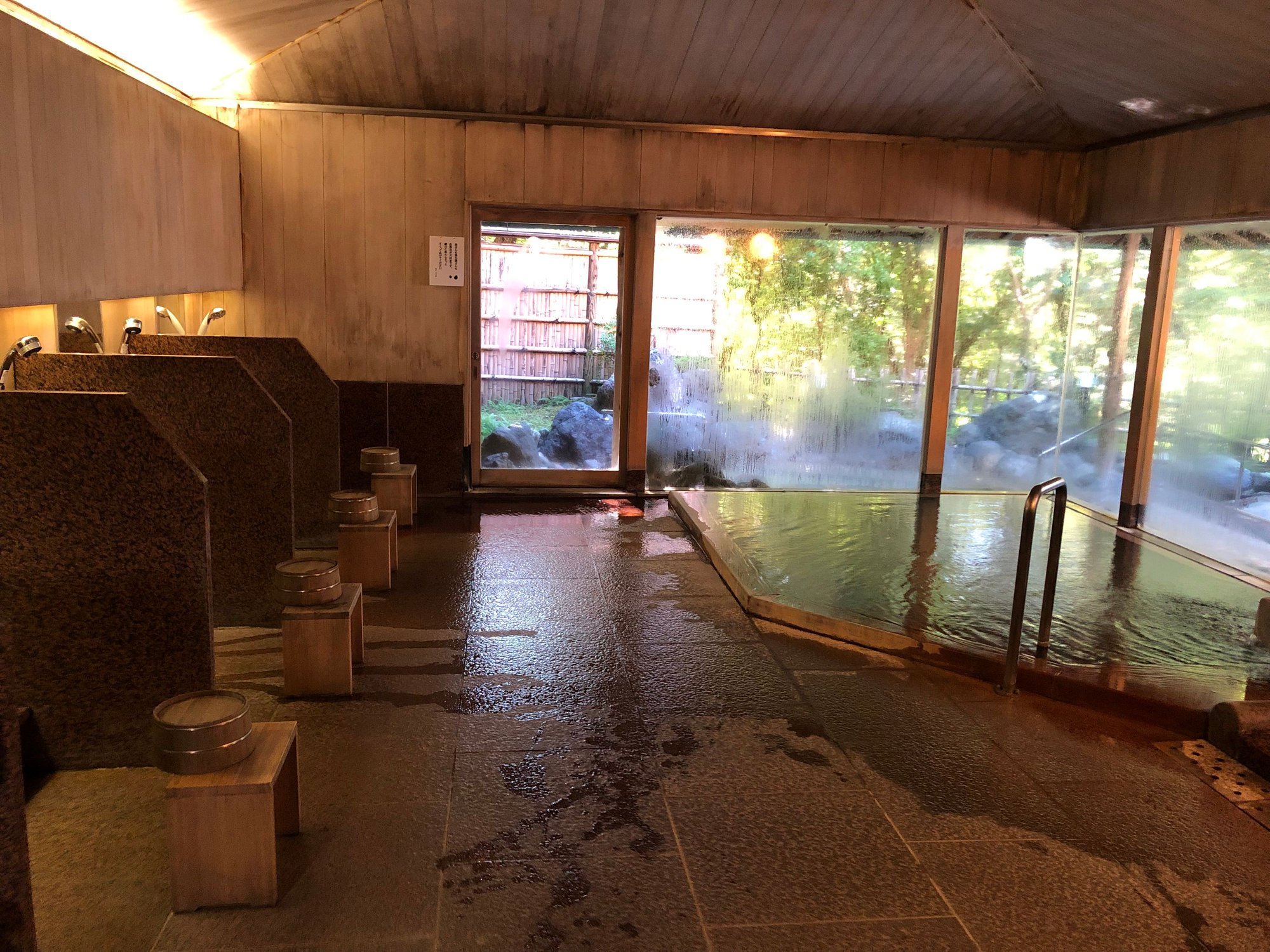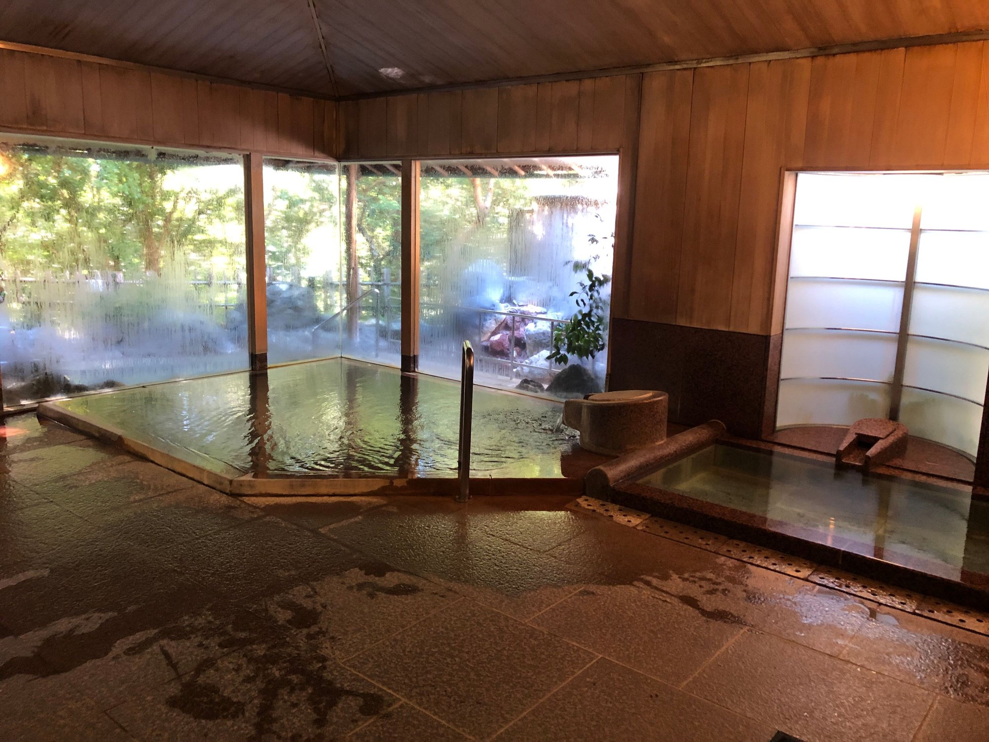 The private bath is of a similar size and design with the same facilities as the public bath, but I found the public bath to be more attractive with a nicer outdoor view, and more relaxing with the gurgling sound of the trickling water feeding the outdoor bath. At our request, our attendant reserved the private bath for us for an hour on the morning of our checkout. We found the sauna and the bathing water in both baths to be perfect temperature-wise, and the cold-water bath was nice and cold.