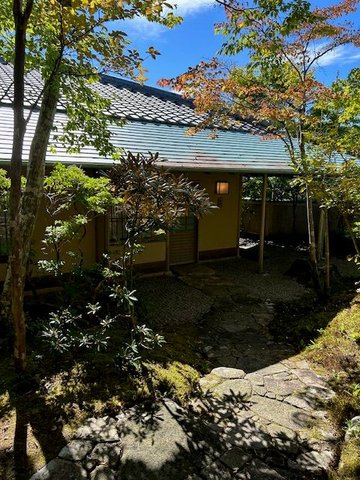 The entire resort is located below street level, so you really can’t see any buildings when you drive by, only the resort’s outer wall. We drove to the entrance gate, which was closed, so we pushed an intercom button to talk with staff who opened the automated gate for us. From the gate we drove downhill to the ryokan’s lobby entrance and were met by staff who greeted us, took our bags, and parked our car (valet parking is included in the ryokan fee). We were then ushered into the guest lounge where the check-in occurs. There we sat in comfortable chairs and were served matcha green tea in traditional large tea bowls accompanied by Japanese sweets. Two other parties, one from the U.K. and the other from Taiwan (their second stay), were also checking in so we chatted with them until we were finally escorted outdoors along a stone walkway to our “room.”