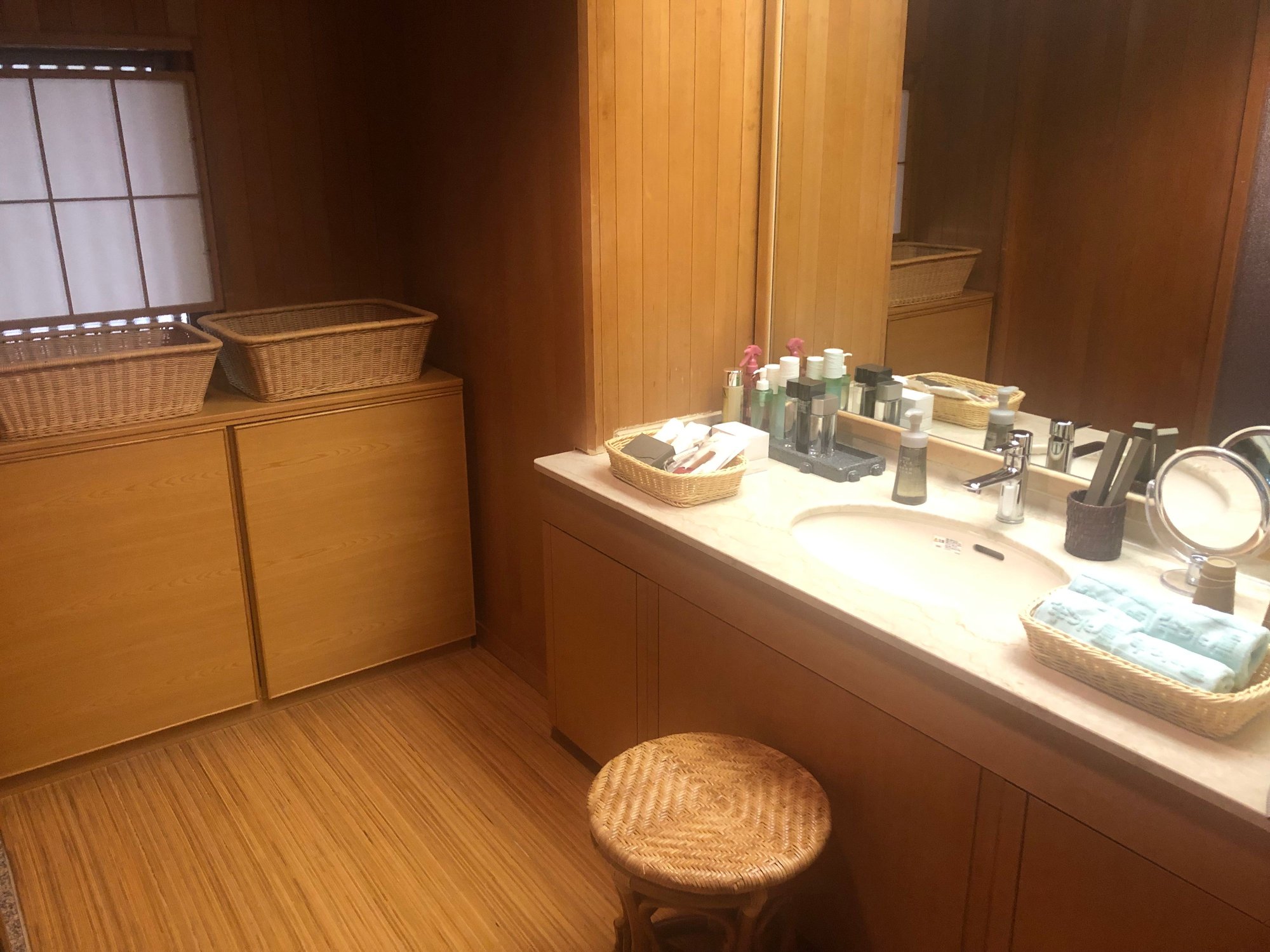 The room is a two-story cottage connected to other cottages and the onsen baths (public and private) through a long fully carpeted indoor hallway. The standard (basic) rooms are a massive 2,691 sqft. (250 sqm.). The first floor consists mostly of a private dining room where all meals are served and a smaller room where your private room attendant/server prepares teas, beverages, and other items. The attendant also brings the food cooked by the chef at a central kitchen and serves it. The second floor consists of a carpeted bedroom, ours had two Western-style beds, a separate tatami-floored living room with a low table, and two Japanese-style floor chairs. There is also a refrigerator (all drinks in the fridge are complimentary) in a separate area off to the side, a bathing room with a hinoki (cypress) bath, a room with two sinks for washing and brushing one’s teeth, and the toilet is in a separate room. The property has a total of 14 cottages, which were all occupied during our weekend stay.