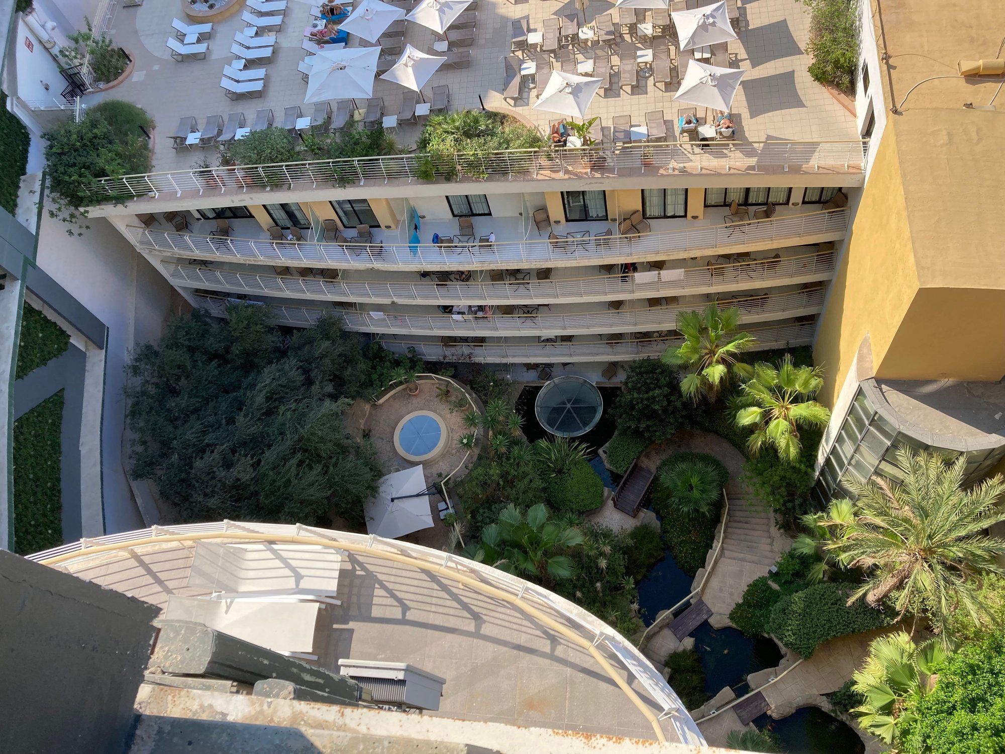 Looking down to see the side garden and on top the sundeck conneting to the lower Narcis pool on level 10