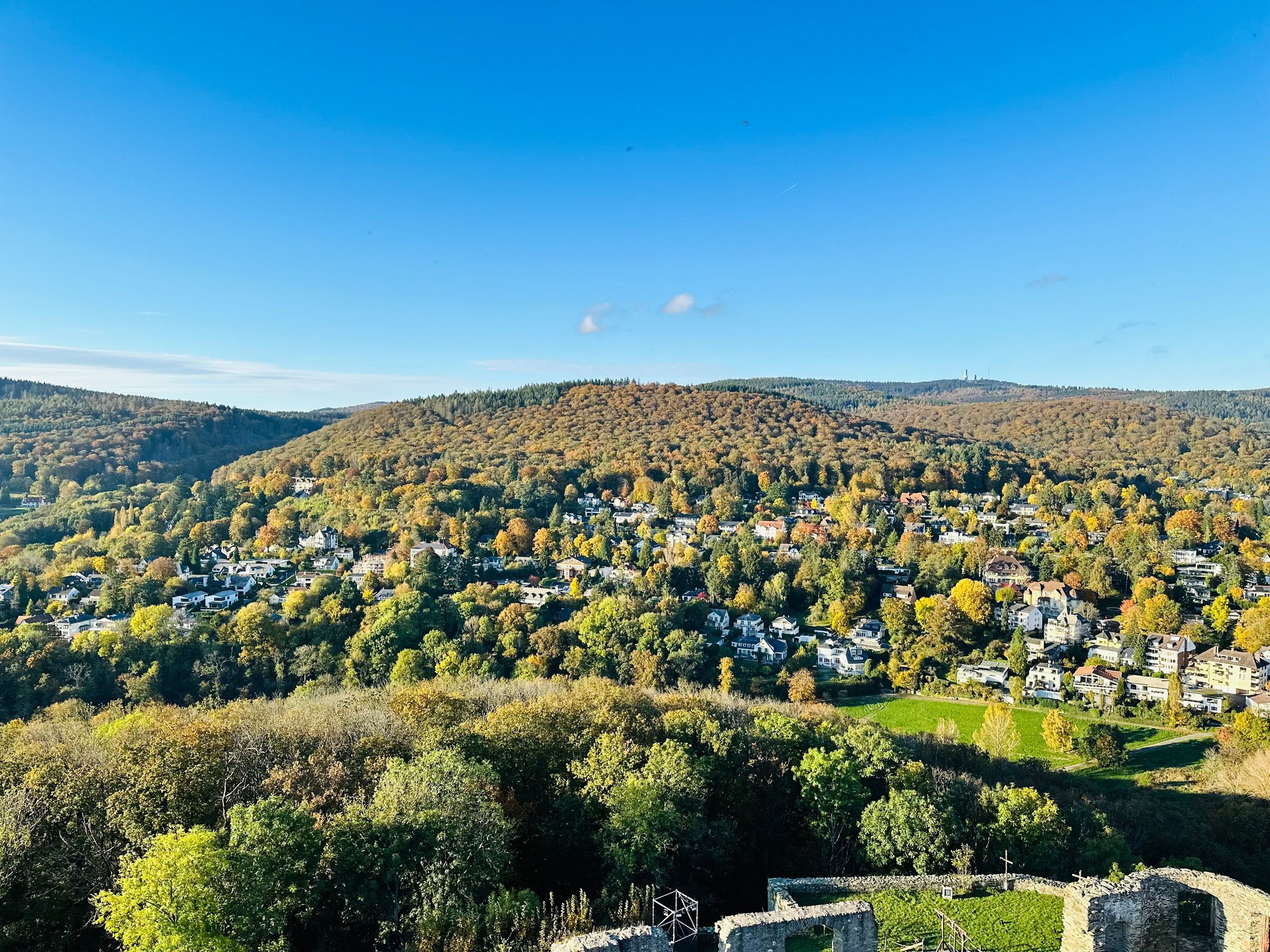 So what’s to do here, and why pick this property over the other Marriott affiliated Falkenstein Grand? Well, the villa is situated on a 50 acre lot, and the surrounding gardens and lawn are exceptionally maintained. Walking around the property and admiring the architecture of the villa was just relaxing. In addition, upon settling in we embarked towards the village of Königstein, a mere 20 minute leisurely walk from the villa and we explored the charming town with many shops and restaurants full of locals. In addition, we did visit the ruins of the castle, which costs 3 euro per person, and something we personally enjoyed. The trek towards the ruin was quite on an incline, so just a warning that comfortable shoes would be advisable. It appears to be a popular area for locals to visit as given the time of the year, the grounds leading up to the tower were adorned by Halloween decorations that were a hit for adults and kids. Now, let me tell you about the tower. The top is actually accessible. Whether one should climb up is left to one’s risk limits. Externally, it’ll make you question if it’s safe, and the interior steps were narrow and certainly dark, and I’m not sure how many steps one need to overcome, but surely we were sweating when we made it up there. Overcoming our initial hesitation, and I may have misled my other half by leading and by kept telling him, “just one more flight of stairs” but truly the reward up top was magnificent. The beauty of Bavaria in transition to golden colors under the fall sunshine was just hard to describe. It simply was beautiful.