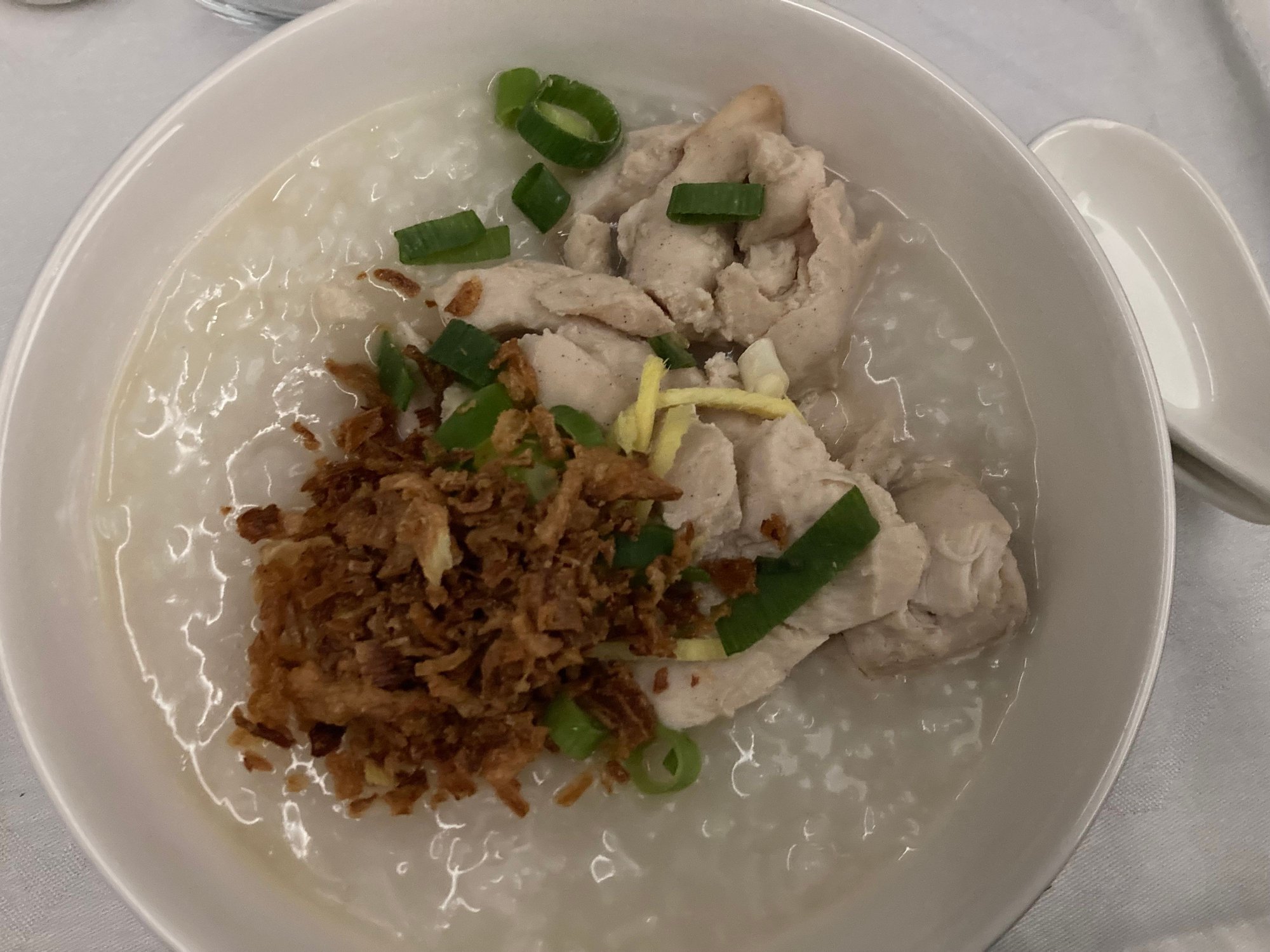 Chicken congee with cruller, spring onion, ginger, fried shallot.